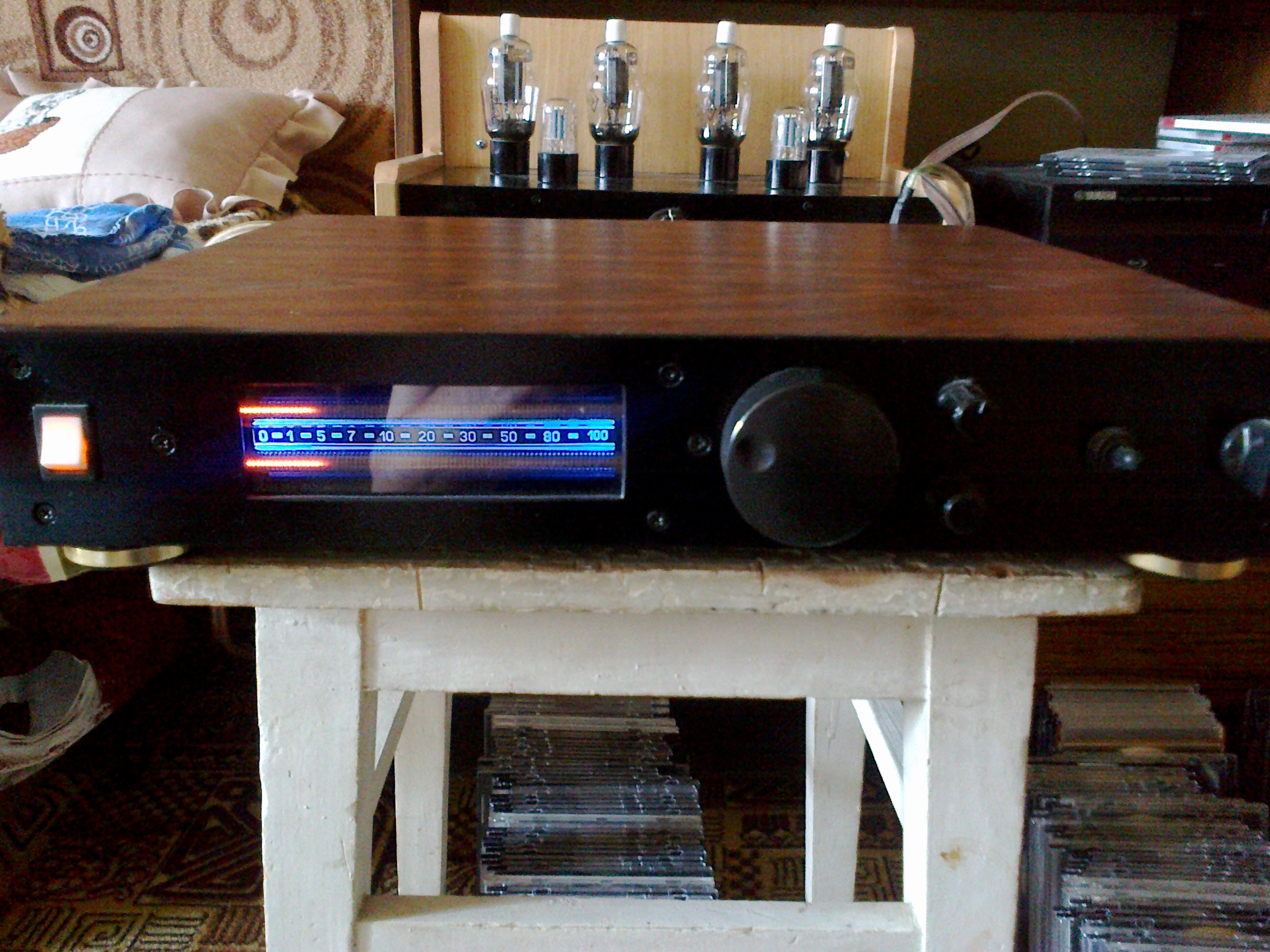Является законченным изделием, имеющим предварительный усилитель и отключаемый темброблок. В выпрямителе применены диоды Шоттки SR30100 в удобном корпусе ТО-220. Емкости по 22 000 мкф в плечо. Отдельный стабилизатор, питающий предварительный усилитель. Тороидальный трансформатор небольшой высоты, позволивший сделать аппарат очень невысоким - 60 мм, при этом развивающий мощность 60 Ватт на канал. Кроме того, надо отметить логарифмический индикатор выходной мощности на газоразрядных трубках ИН 13, какие стояли в Олимпах 004 и Электрониках. Смотрятся очень красиво.
