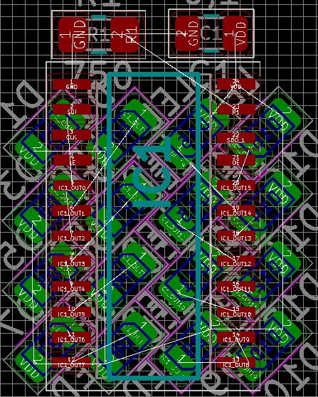 Чтобы максимально упростить я разместил диоды как можно ближе к выводам мультиплексора. Тогда получается, что диоды встают в поле почти хаотично. И расположение в следующее поле со своим мультиплексором тоже встают в такой-же порядок. Но второй ряд получается, что нужно начинать с другой стороны.