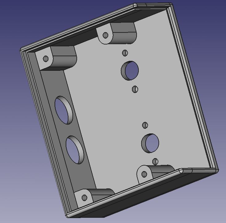 Стойки и подложки (снизу), куда ложится плата, выполнены от центров отверстий платы, придерживался диаметра 6 мм. + зазоры по краям платы 0,5. Стойки "примазаны" к стенкам корпуса. Из-за этого наверное и кажется что они большие.