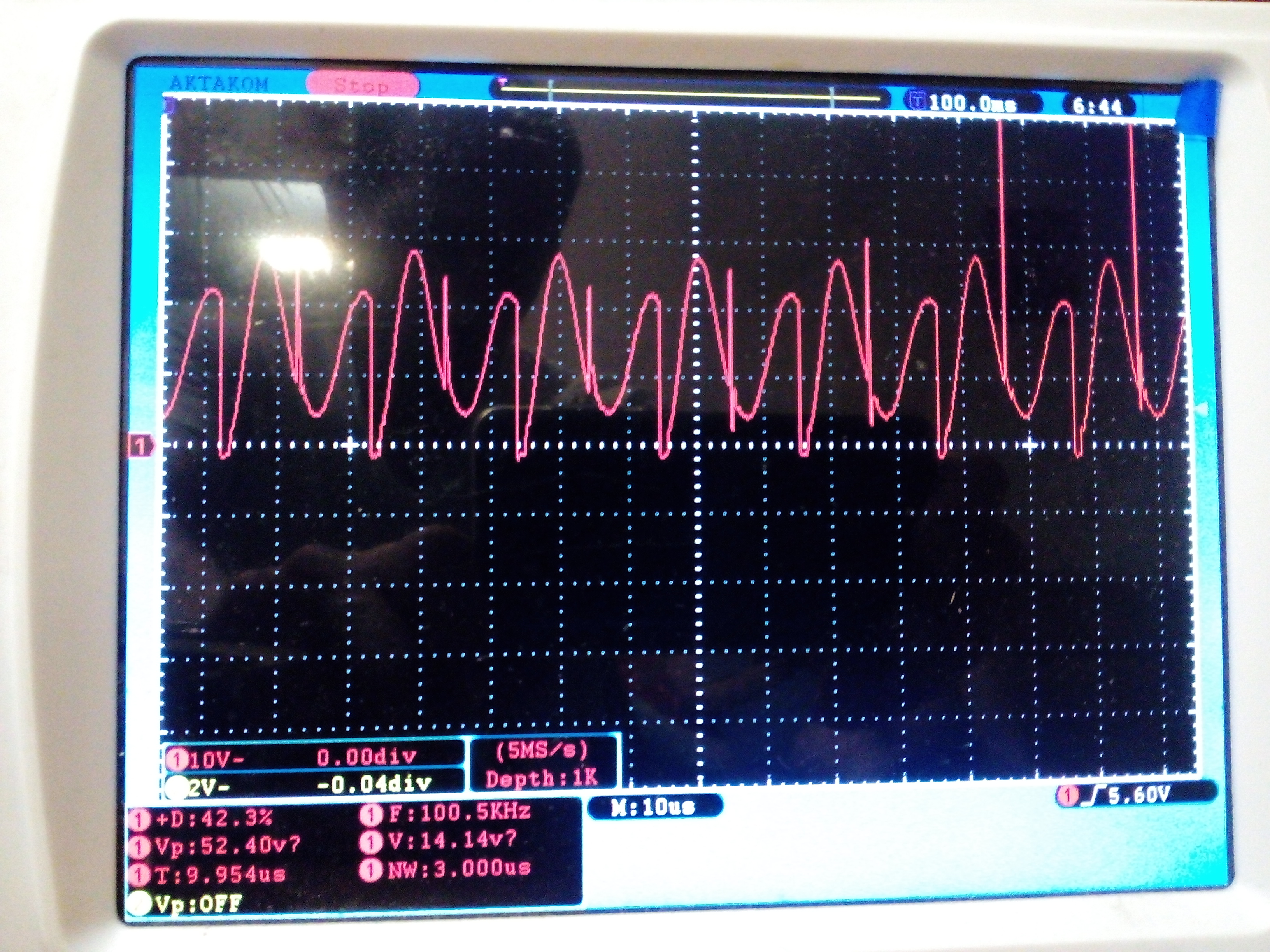 2. Если есть возможность, поставьте последовательно с L1 резистор в 0,01-0,05Ом и снимите с него осциллограмму в режиме открытого входа. Ток через резистор не должен прерываться и резко увеличиваться на циклах заряда. Все измерения проводить ТОЛЬКО С НАГРУЗКОЙ!
