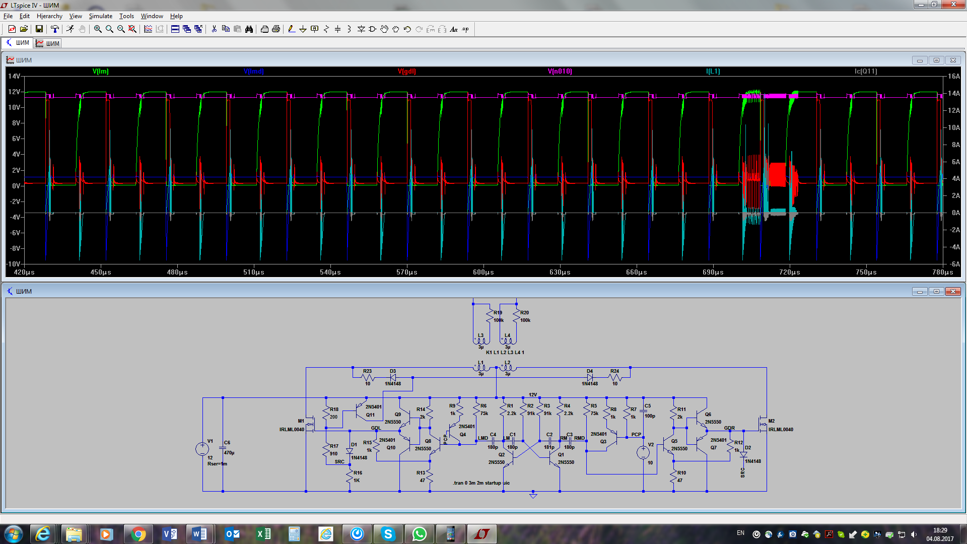 Ну схема как схема. Если разобраться, то простая и надежная. Дискретная база пусть не смущает. На то тоже есть свои причины. RC цепочку ставил параллельно диода D17 туда и щупы осциллографа. Рассматривая природу явления и литературу, пришел к выводу, что вина появления первого микросекундного импульса во время начала силового импульса на вторичке это выпрямительные диоды, точнее время закрывания. Несколько скриншотов для пояснения этой мысли. Далее этот импульс вышибает звон из всего, что есть. Утратил надежду его усмирения.