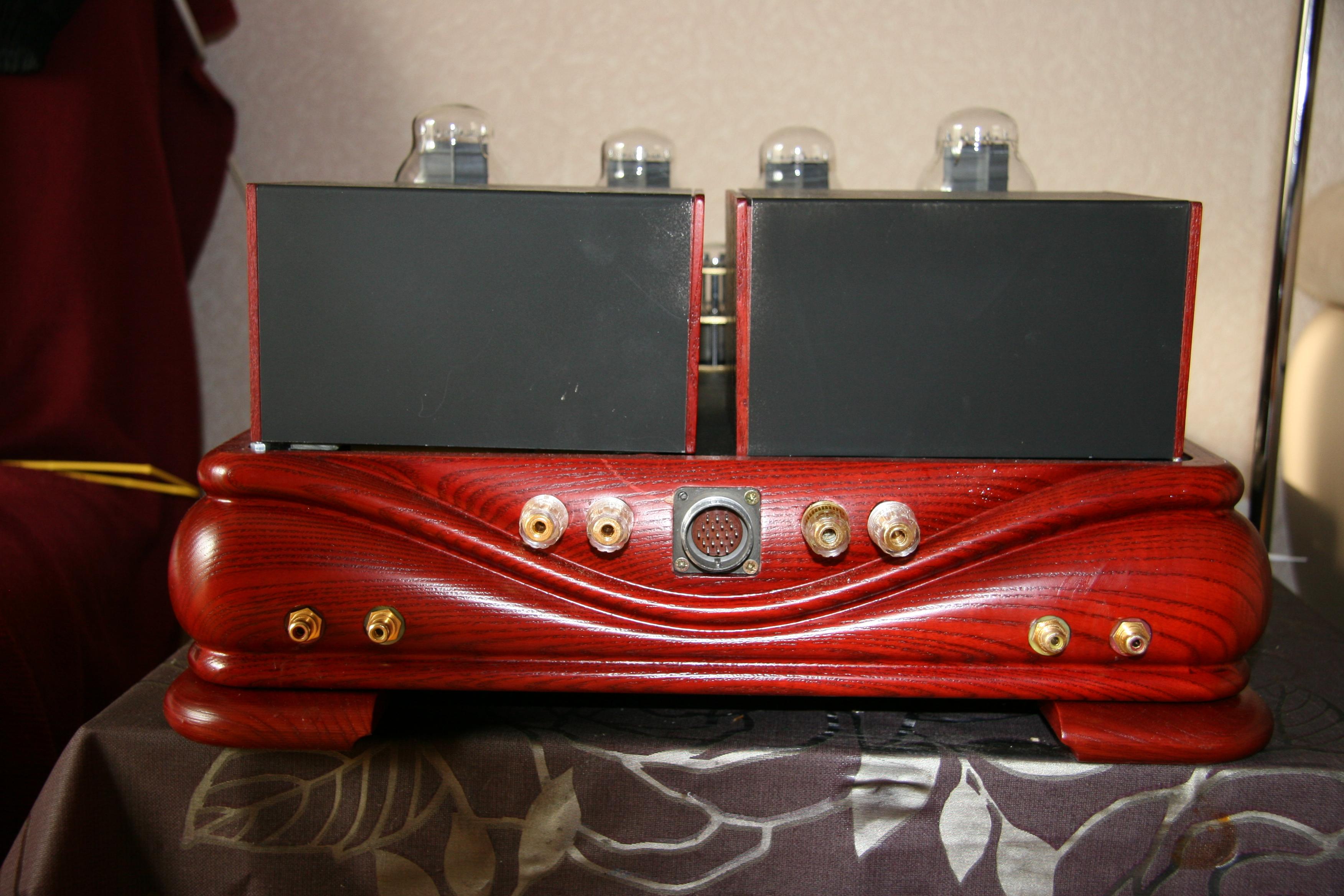 Поскольку усилитель себе любимому, то его конструкция должна вписываться в интерьер помещения: деревянный корпус цвета вишни (красноватый оттенок, не красный как на фото). Корпус должен быть подъемным, поэтому блок питания сделан отдельно. Получилась двухблочная конструкция: собственно усилитель весом 27 кг и блок питания весом 15 кг.