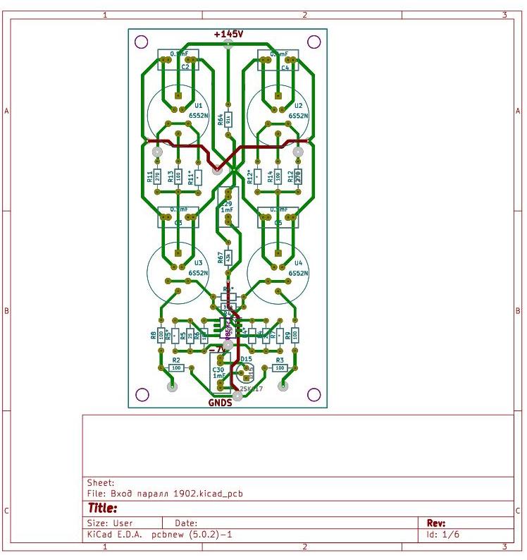 О! Это уже значительно лучше. Я бы "спрятал" все накальные цепи на обратную сторону, оба полюса питания накала расположил по центру. Звезду накала собрал бы не на входной "клемме", а на полюсе конденсатора.