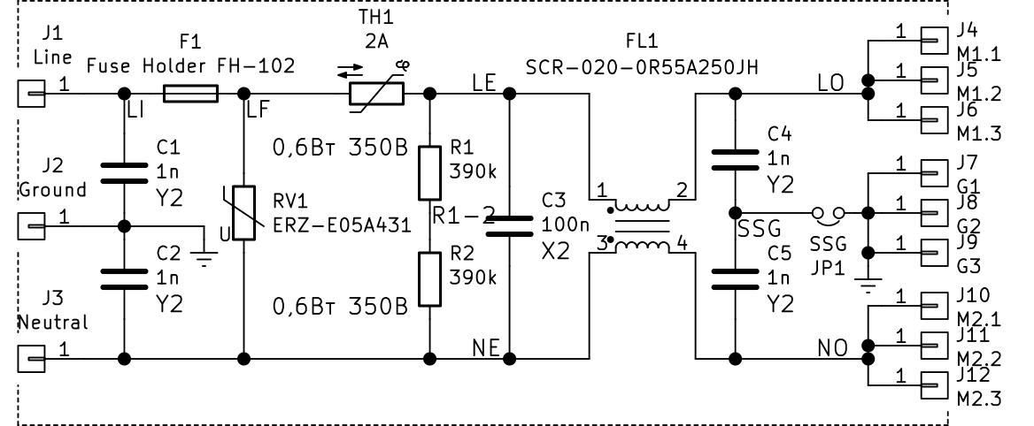 Во всех дифференциальных звеньях стоят конденсаторы X (например, для фильтра 2А: С3 на входном фильтре, С3 и С4 - на выходном). В состав первого дифференциального фильтра (к сожалению, чисто номинально) входит TH1, второго - индуктивность рассеяния FL1 входного фильтра + два обычных дросселя выходного фильтра, третьего - индуктивность рассеяния FL1 выходного фильтра).