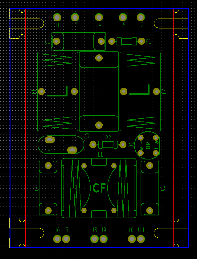 Форм-фактор входных фильтров предполагает установку в варианте 60х80мм (50х70мм - установочные отверстия, синий прямоугольник, позволяет поставить плату над или под входной), варианте 50х80мм (40х70мм - установочные отверстия, красный прямоугольник, лишние "ушки" отрезаются или отламываются по углублениям, позволяет поставить плату над или под входной), варианте 50х50мм (40х40 - установочные отверстия, отламыванием или отрезанием монтажной части по фиолетовой линии) или задвиганием в салазки не толще 3мм с расстоянием между ними в 50мм (имеются свободные пространства с двух длинных сторон платы, длина платы - 50мм).