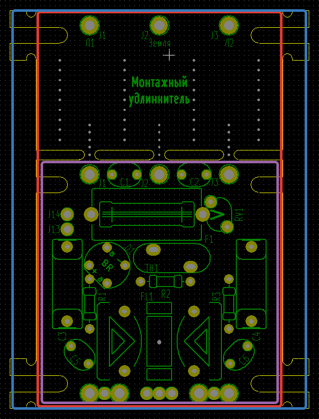Да, он именно для этого. Плату можно использовать и без него (предусмотрены пазы, перемычки в которых могут быть перерезаны). Т.е., если платы входного и выходного фильтров крепить отдельно, то имеем полностью заполненную плату 50х50мм как входной фильтр и 50(60)х80мм - как выходной.