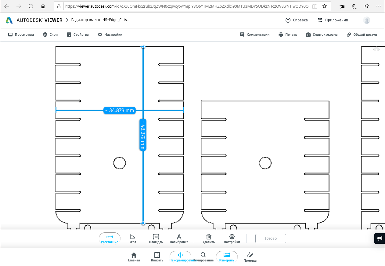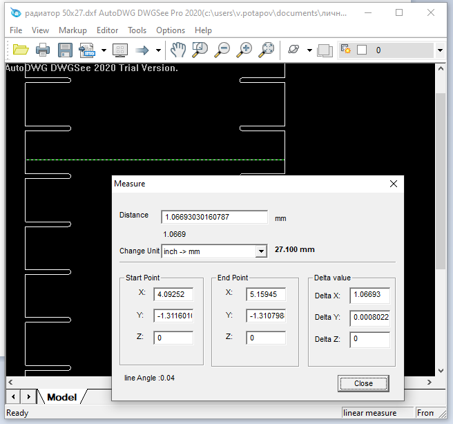 И еще по масштабу DXF файлов. Я взял ридер из поста Александра viewtopic.php?p=26871#p26838 и открыл им присланный вами файл "Радиатор 50х27". И при перемещении курсора по контуру радиатора ридер действительно показывает размер по Х-оси от 4,09 до 5,16 мм, т.е всего 1,07 мм вместо ожидаемых 27 мм.