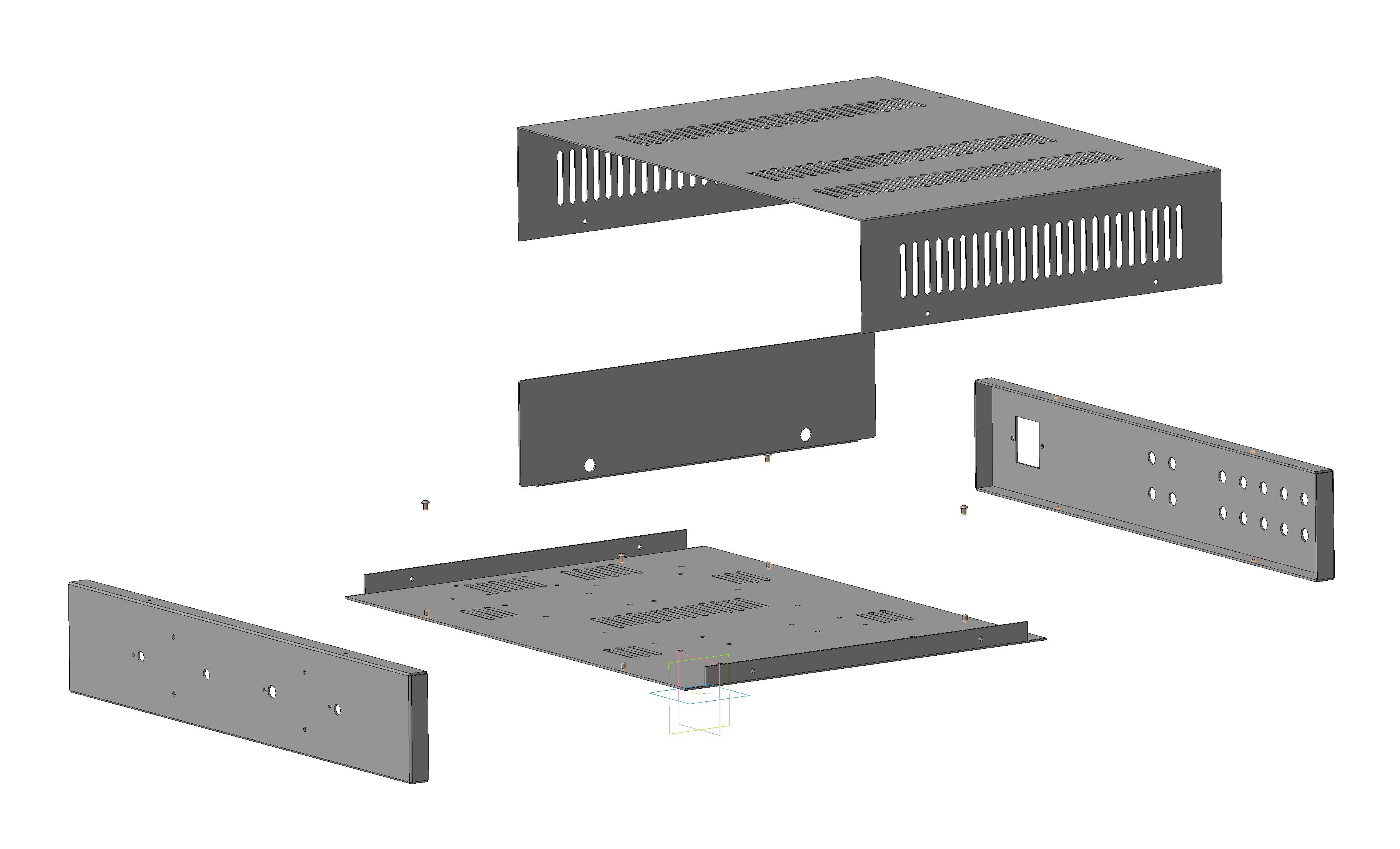 Я нарисую и дальше все в масштабе (добавлю разъемы и селекторы). Можно будет двигать и крутить. Чтобы определиться с размером корпуса. Но, я думаю, "не универсальный" корпус будем окончательно рассчитывать, когда компоновка фонокорректора прояснится. Все-таки эти два корпуса нужно как-то соотносить друг с другом визуально.
