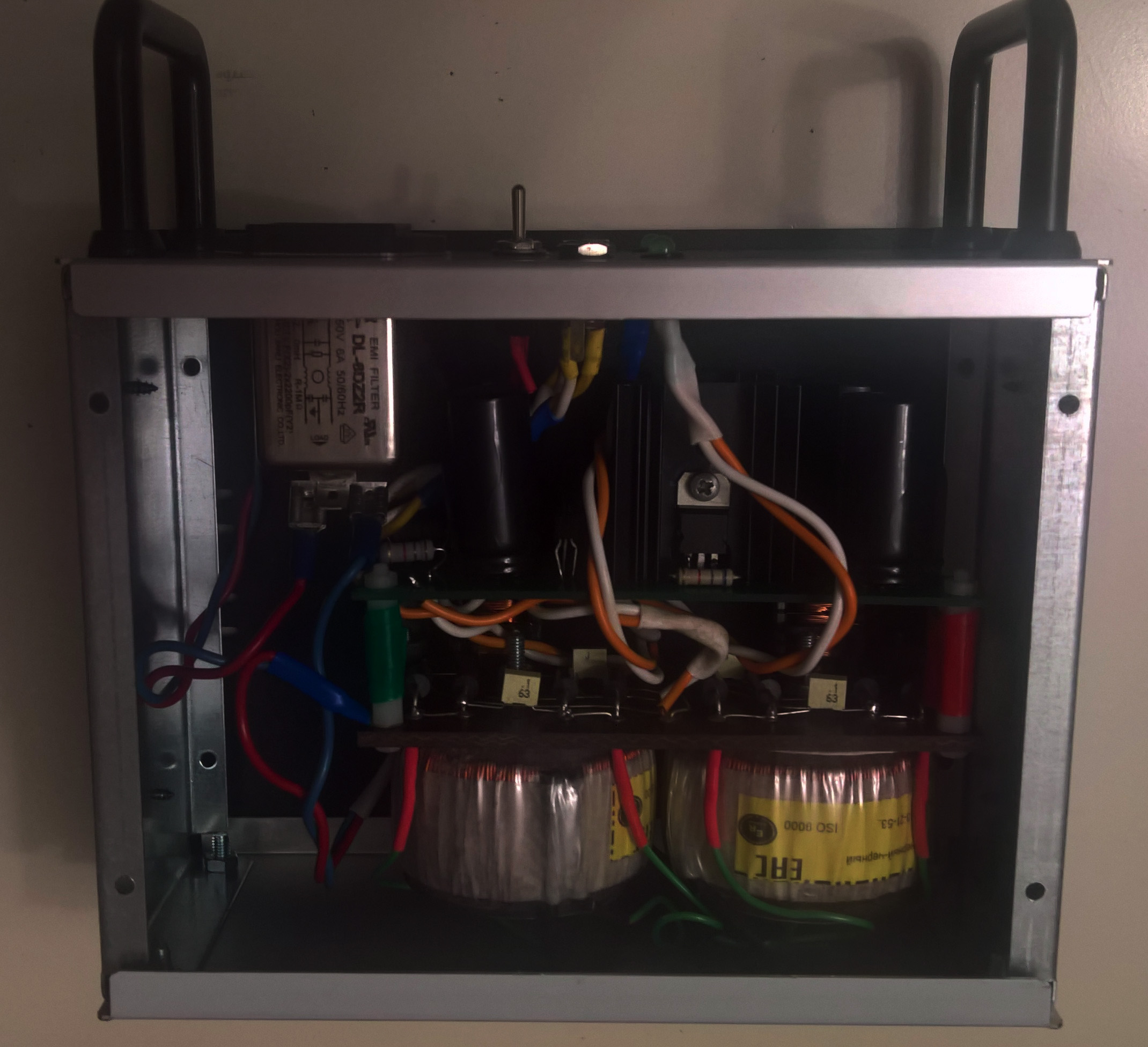 Выпрямительную часть я сделал из двух тороидальных трансформаторов, приобретенных в Чип и Дипе, на перфорированной плате, предоставленной Евгением и "зеленой" плате простого БП, реинкарнированного Яном. Всё получилось как нельзя лучше! Небольшой отчетик: