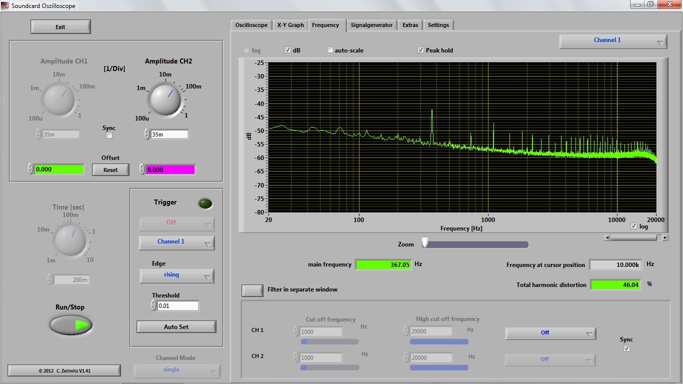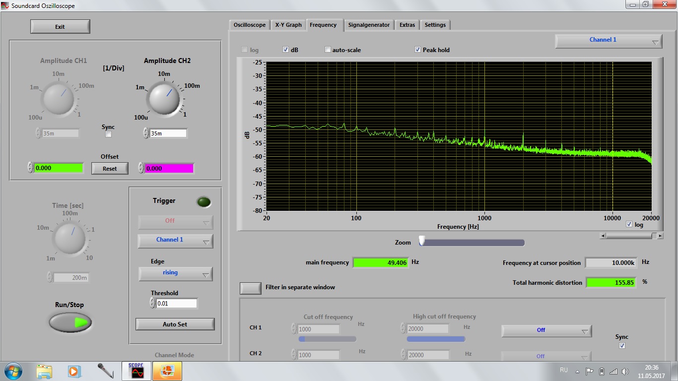 Результат получился интересный (на мой взгляд). Поэтому, я продублировал измерения при другом масштабе шкалы.poty писал(а):Чтобы снять многие вопросы, я бы также запитал Piccolo от аккумулятора и подключил его тупо к ноутбуку, работающему от батарей. Здесь мы вообще всё от земли розетки отрываем!