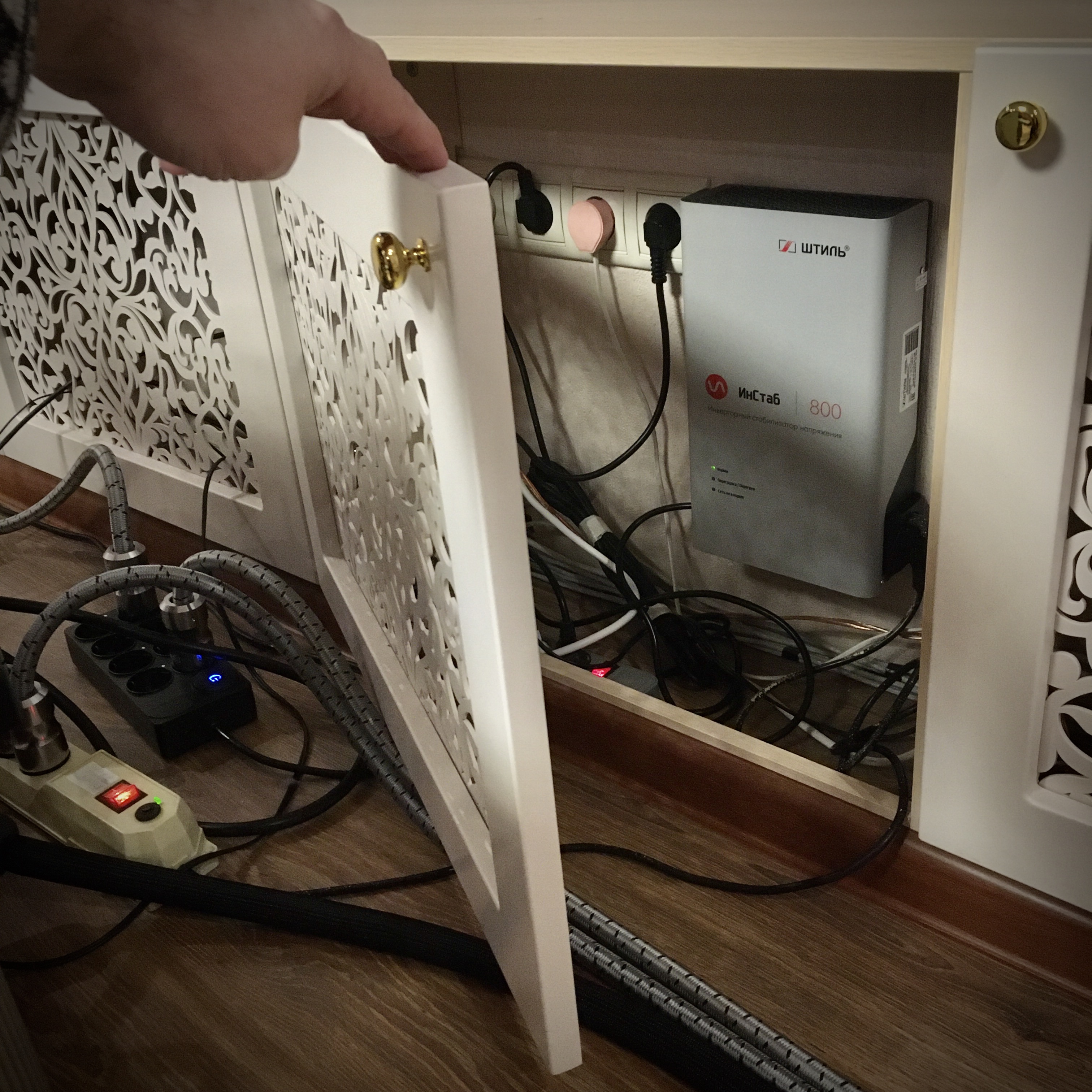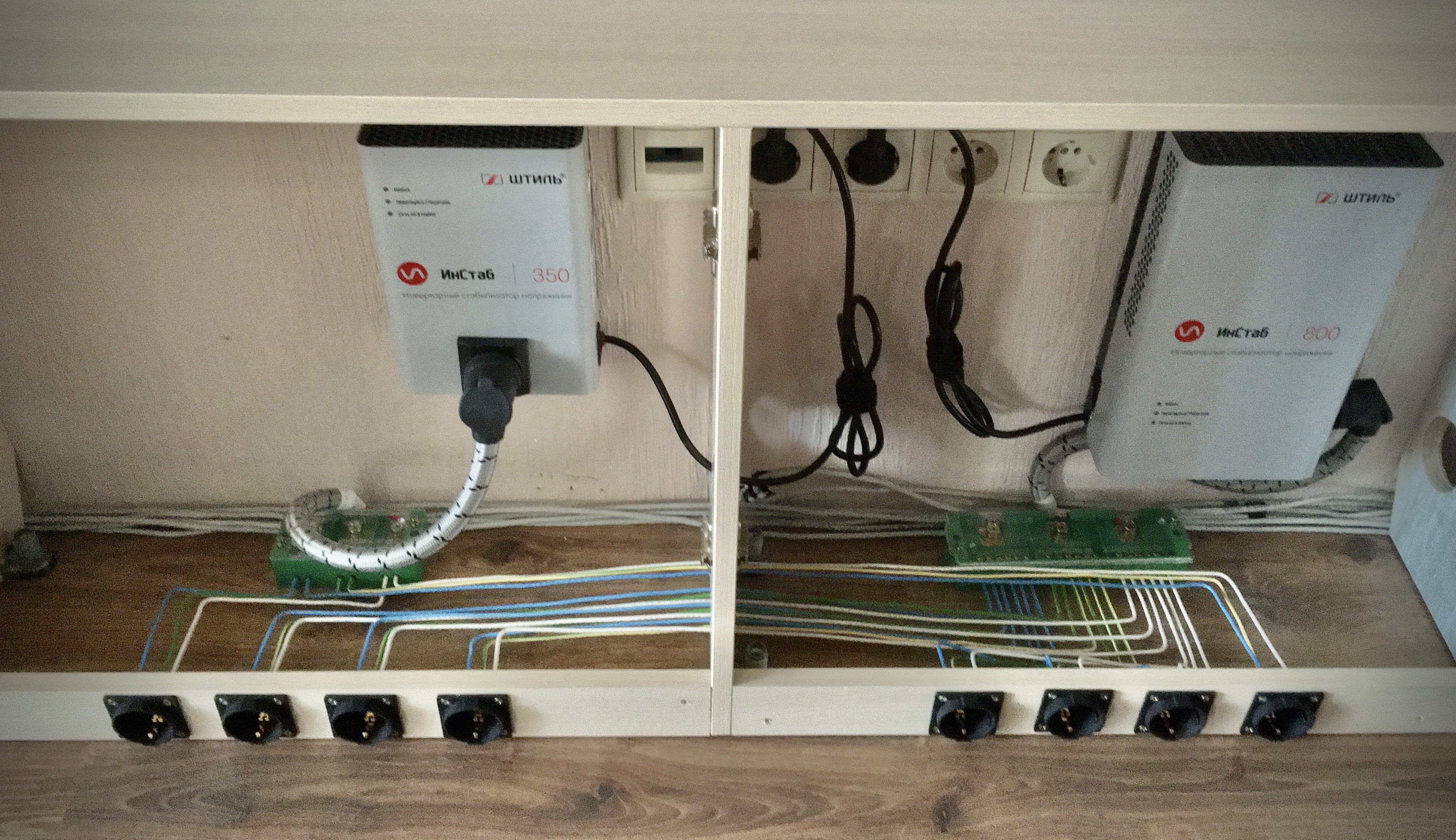 Поэтому, сделал дистрибьютер внутри ящиков за стойкой, что и запланированы были под питание. Провода закроются "полкой" из того же ЛДСП. Доступа к ним уже не будет.