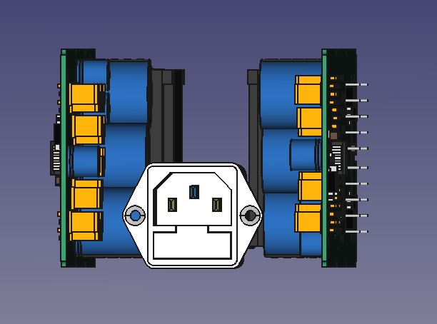 Если чуть раздвинуть эти морды - разъем встанет между лепестками, сверху над ним на одном из бп можно поставить тумблер, снизу выходной разьем. И это раздвижение может дать маневр для установки тумблера включения м/у трансами. Весьма вкусный вариант