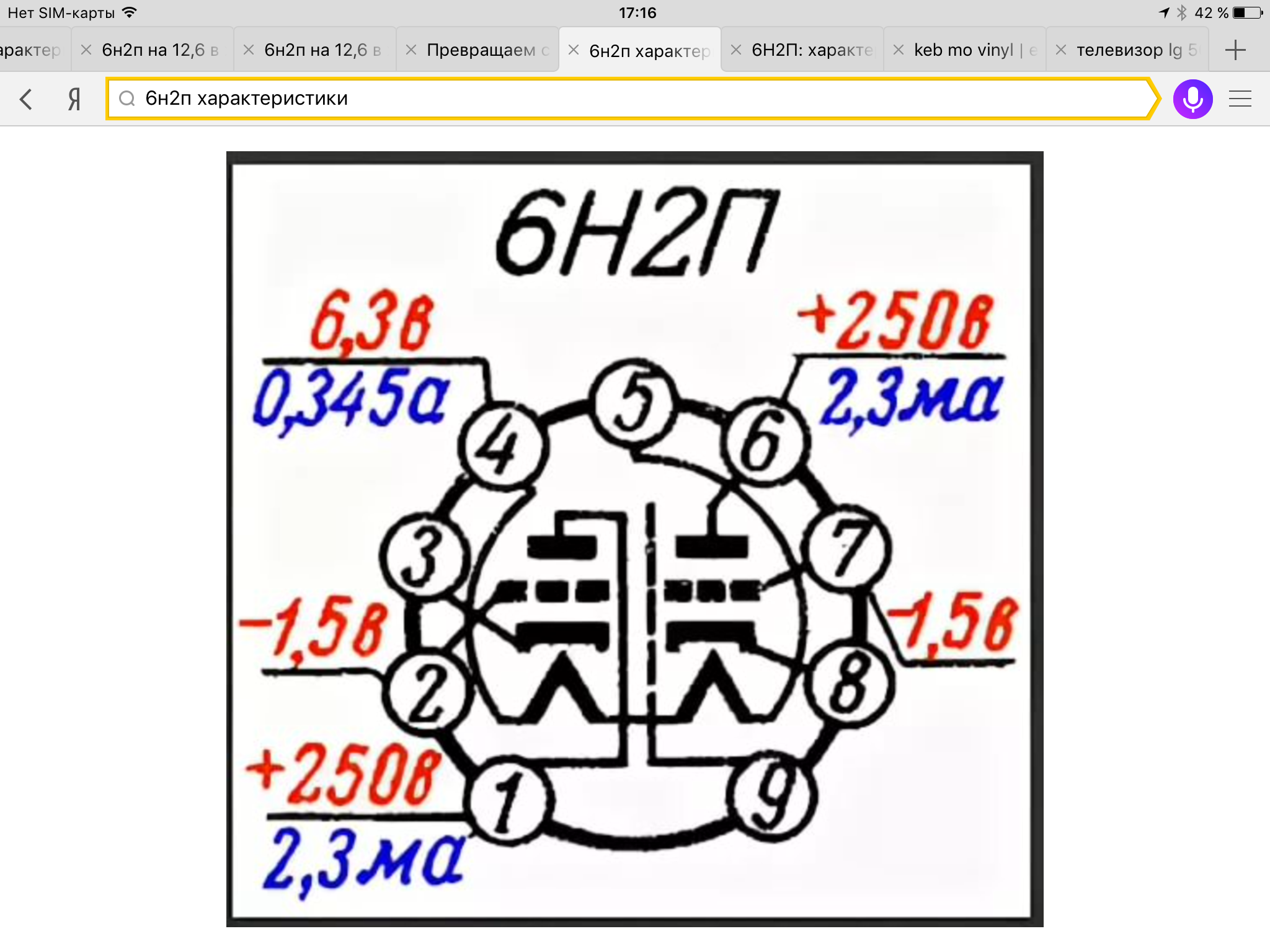 Дождался субботы, поехал на Птичку. У одного слепого деда нашёл одну лампу 6Н2П-ЕВ. Побродил, вспомнил совет по телефону. Зашёл в павильон и получил коробку этих ламп-1982 года выпуска. А 1960 никто и не обещал. Докупил ещё кулёк. Дома, учёный я, тестером взялся их прозванивать. Первая дохлая. Вторая то же. Третья....что все что ли? Как так то? Ну хоть пара? Сравнил с лампой деда- совсем новая, не юзаная. То же самое. Ни 4, ни 5 пин на 9 не звонятся. Для самоуспокоения проверил все. Картина одинаковая. Вспомнил слова, где то на форуме, что у них цоколёвка не соответствует 12АХ7. Посмотрел на Datasheet верхней картинки. Все соответствует. Полез за Google. Открываю такой Datasheet. Засада. 9 ножка это экран между двумя лампами в одном баллоне. Понимаю, что лотерея со мной злую шутку сыграла. Подсунула мне сначала " левый" Datasheet. Мне что, надо было 40 шт их по открывать? Что бы убедиться, что это не левак? Перепаивать ламповые панели на 6Н2П, потом возвращать под 5751 не захотелось. Прогулялся на eBay, посмотрел на переходники. https://rover.ebay.com/rover/0/0/0?mpre ... 2809155598 Есть такие. Мне бы сейчас? Опять ждать месяц? Не наш путь. Посмотрел видео, как переделать нашу 6Н2П в 12АХ7