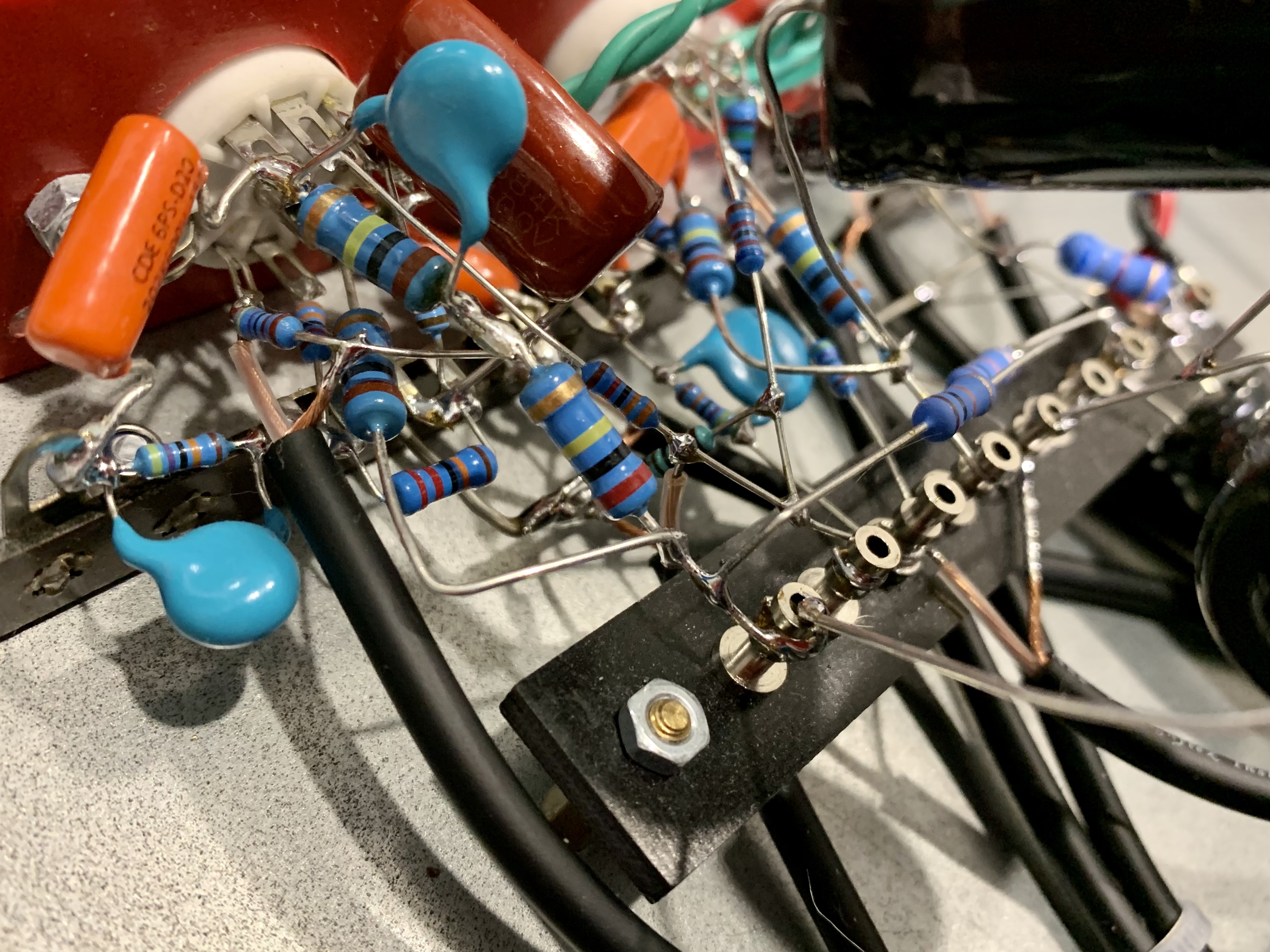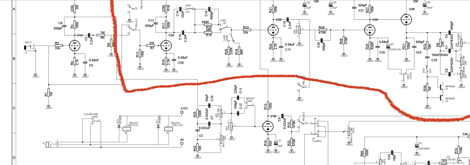 Внизу за красной линией клин канал оригинала - тоже не то, оставил свой клин. А вот то что внутри красной линии притерпело изменения. Это касается катодных конденсаторов, анодных сборных резисторов, фиксированного делителя после первого каскада.