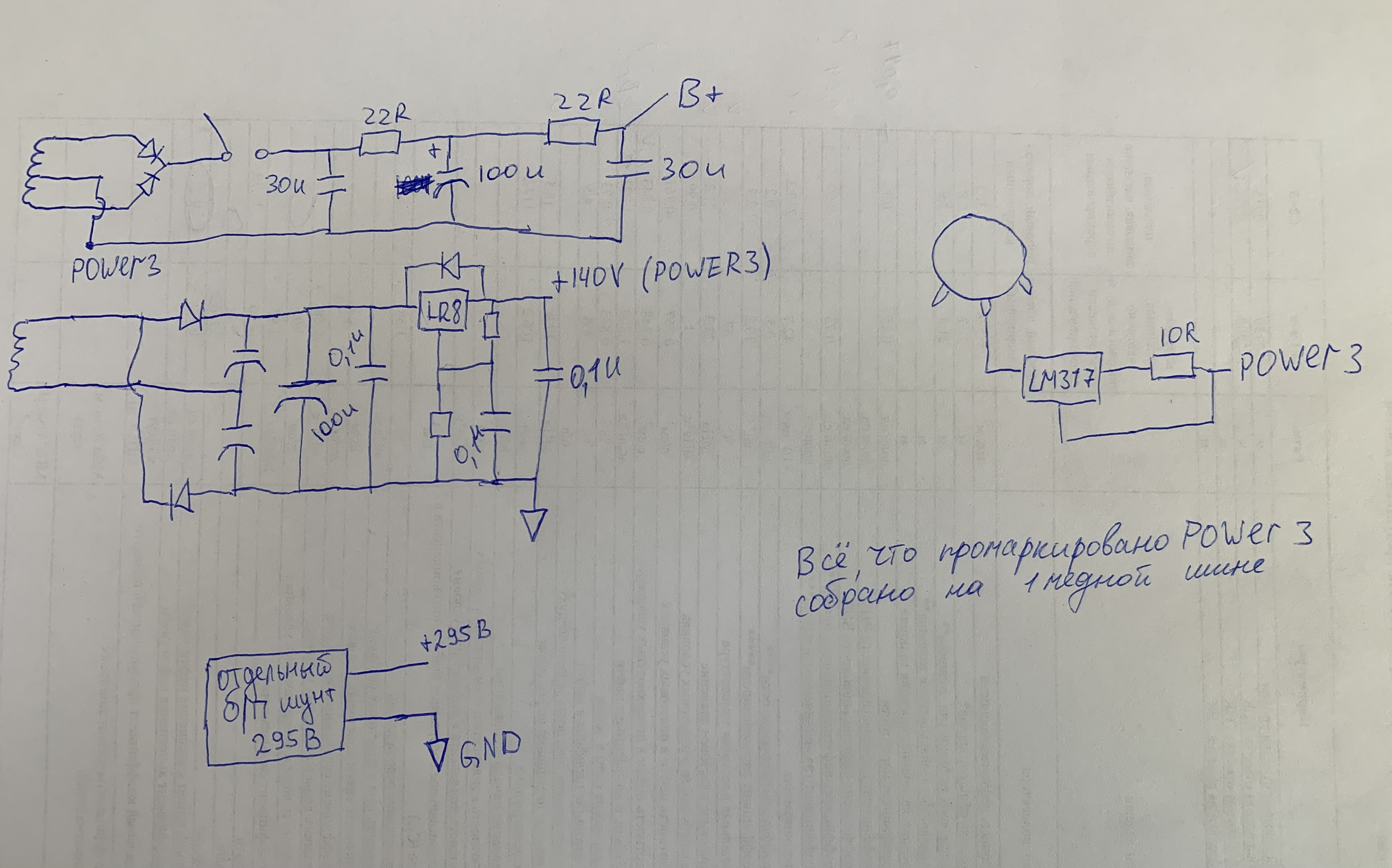 140 вольт проводом идет на медную шину, на ней собраны: земля питания b+ Мощных ламп, земля для источников тока мощных ламп. Схему отрисую.