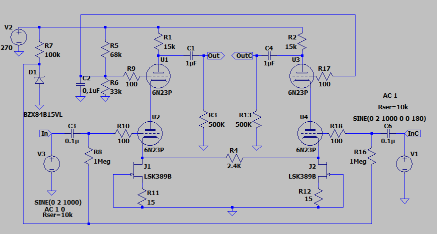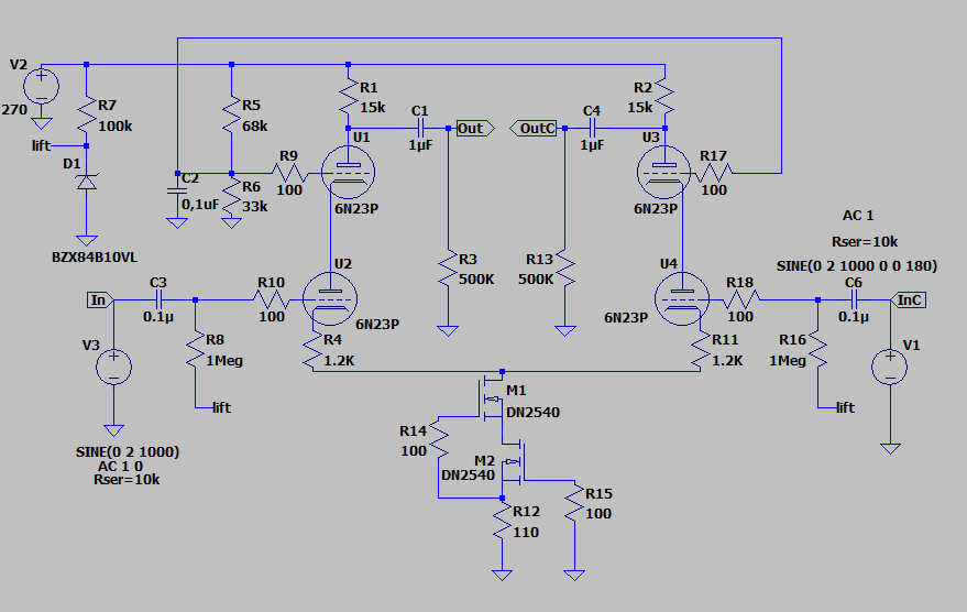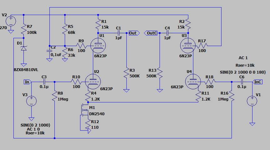 По поводу подбора. Использование DN2540 или любых JFET связано с тем, что мы не можем гарантировать ни величину (т.е., нужно предусматривать подстройку), ни термостабильность тока (по хорошему нужен какой-то термостат, что, с моей точки зрения - абсурд). Положительное в этом то, что это не ухудшает характеристики нашего каскада, если обе половинки настроены одинаково (с помощью независимых подстроек) и изменяются синхронно (понятно, что лучше в этом случае применять подобранные транзисторы). И желательно, чтобы транзисторы были в одном корпусе, чтобы они были в одних температурных условиях. Но практически ситуация не такая страшная.