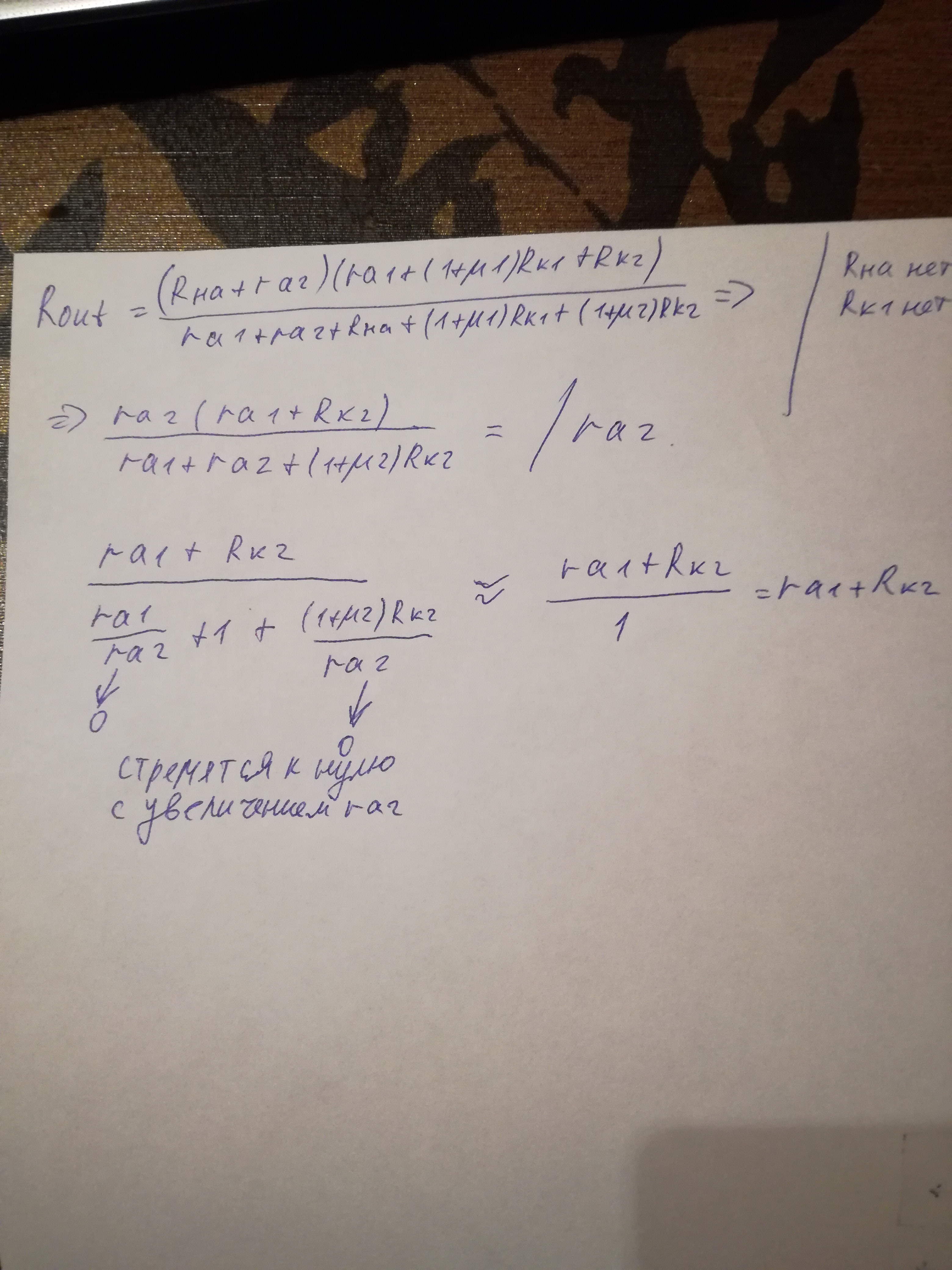 Zout=(Rк3+rэ1)(mu2*Rк2(Ra2+ra2+Rк2)-1)/[(Ra2+ra2+Rк2)(mu2(Rк2+Rк3)+Rк3+rэ1)-1],