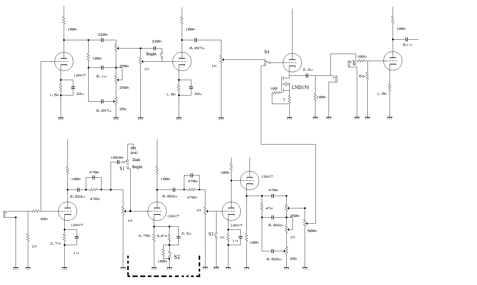 Не ответил на этот вопрос, а Вы и не напомнили мне о нём. Здесь можно применить и LND150, надо только посчитать рассеиваемую мощность и возможность без дополнительного смещения получить с него нужный ток. Если такой ток получить не удастся (ну, хотя бы 5мА), то можно применить лампы с меньшим рабочим током (например, 12AX7) или что-то промежуточное (навскидку не скажу, нужно поточнее посмотреть).Евгений Михеев писал(а):И еще вопрос в возможности применить LND150. Он намного дешевле и доступнее мне для покупки (40 евроцентов на банзае).