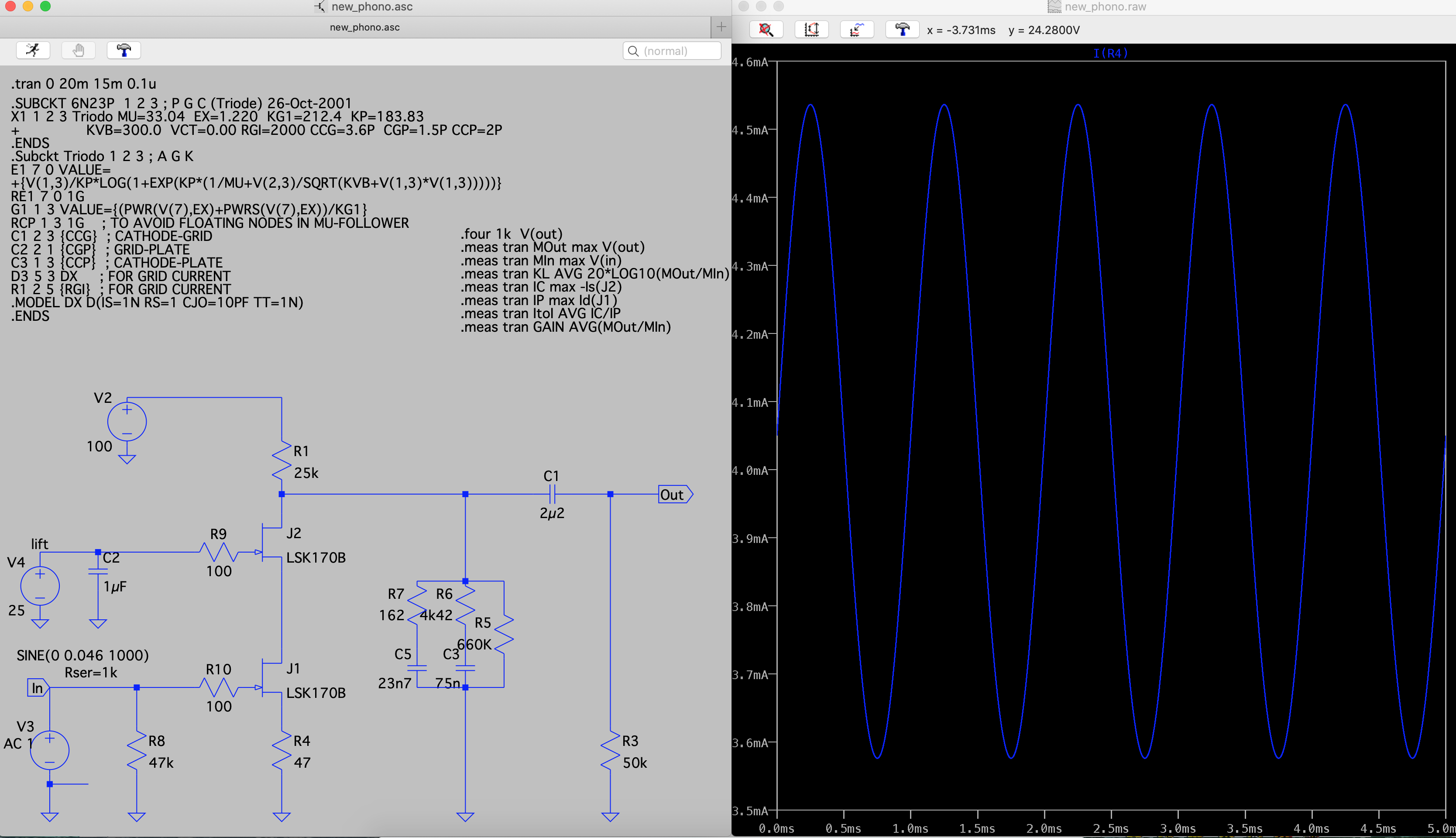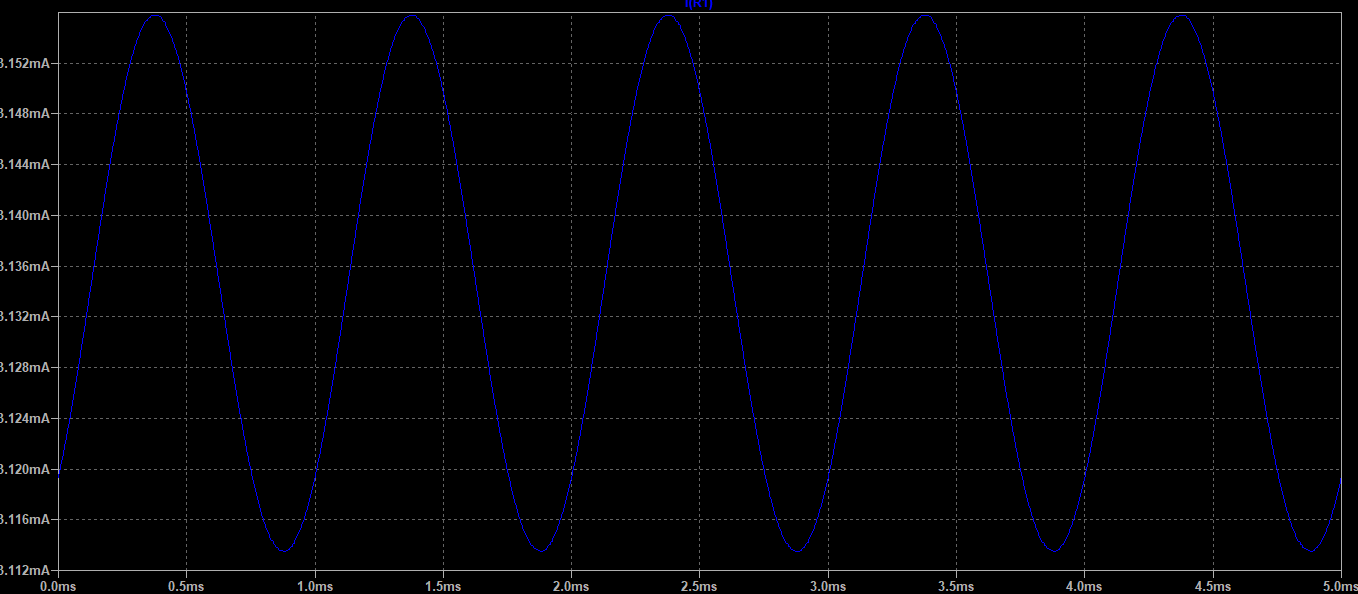 4. Проверяем ток через R1, R2 - форма не должна меняться, клиппирования не должно наступать (ток должен быть всегда больше 0 и запас должен оставаться >10% от номинала - >0,6мА).