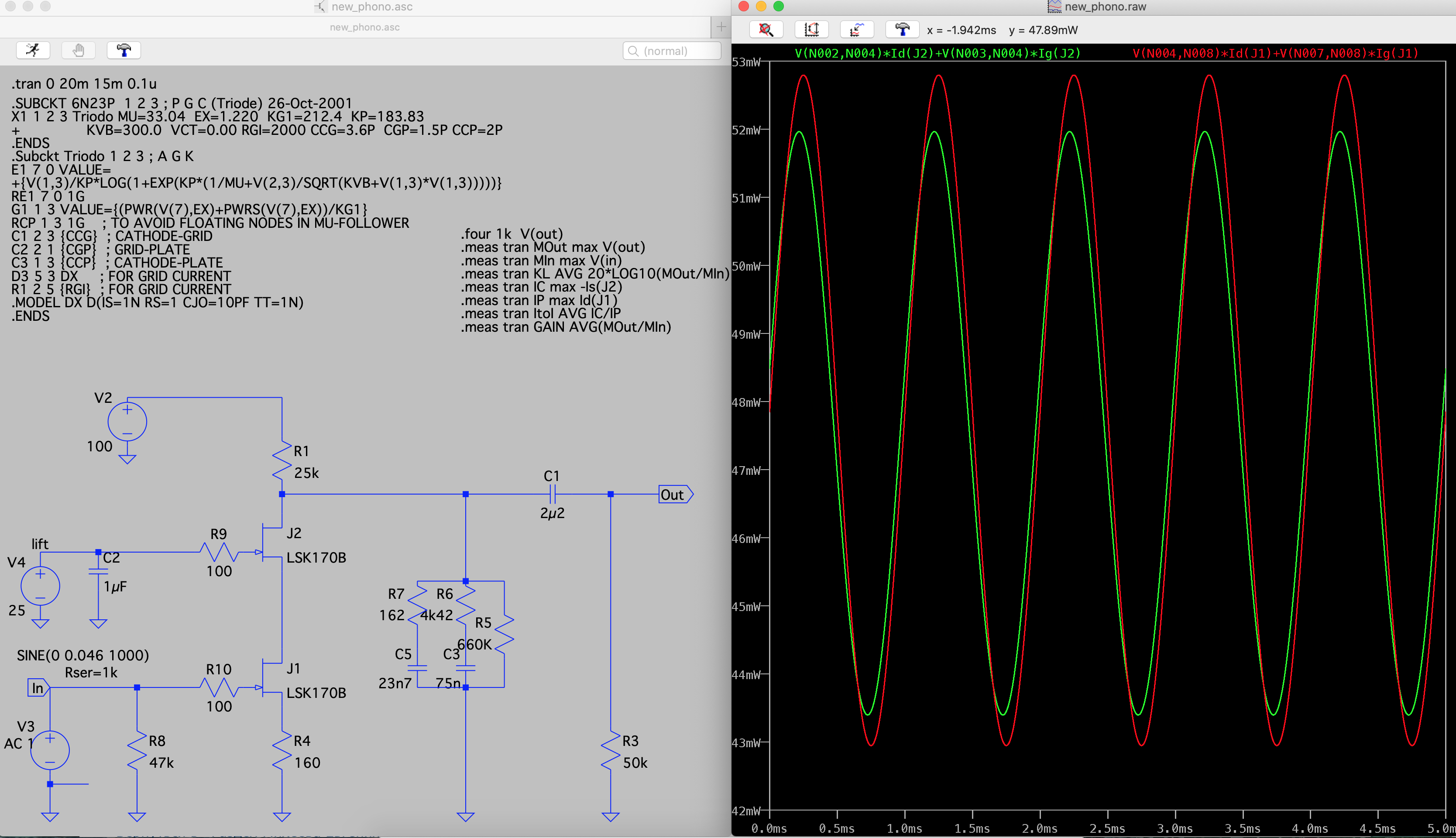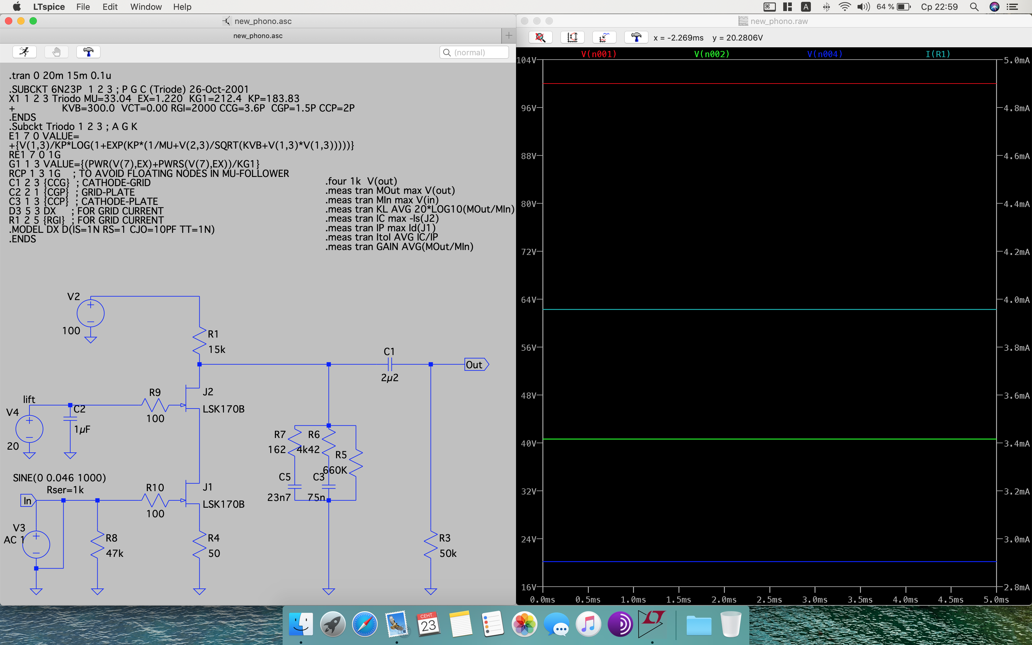 poty, Вот первые прикидки - снизил высокое до 100 вольт, ток получил в районе 3мА, уменьшив нижний резистор до 50 ом, напряжения - на графике, усиление - на мой взгляд большое, сейчас объясню, почему. Я вижу для себя устройство следующим - а каскада, первый - каскод, без "дикого" усиления, затем RIAA, затем еще один каскад, я хочу завершить SRPP, потому как он является усилителем и по току и по напряжению, тут я бы убил двух зайцев - добавил необходимого усиления, правда. насколько помню по прошлым проектам - низкое усиление в SRPP получить весьма проблематично, ну а усилитель по току понятно зачем - каскод с его выходным сопротивлением оставлять в чистом виде опасно перд лицом неизвестной нагрузки. Такие соображения.