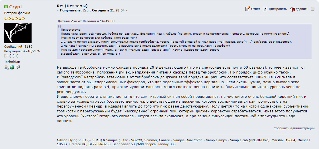 "аттенюация темброблок-send - 40 раз" Исходя из того, что мы договорились, что на входе непрофессионального эффекта должно быть -10dBV (0,32В RMS), это означает, что на выходе темброблока должно быть 0,32*40=12,6В RMS для синусоидального сигнала, а никак не 20, которые указаны в первой фразе. Предполагаю, что речь идёт всё же об амплитудных значениях, но точно сказать трудно.