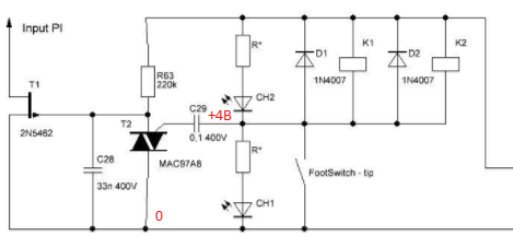 Для начала рассмотрим ситуацию №1, когда переключатель Footswitch разомкнут и времени после этого прошло много. Конденсатор C29 заряжен до примерно 4В (правая обкладка подключена к средней точке между двумя цепочками R*CH2||K1||K2 (значительно меньшее сопротивление), R*CH1 (значительно большее сопротивление) и имеет потенциал +4В, левая обкладка - через сопротивление утечки перехода управляющий_электрод - Т2 симистора Т2 - к земле, потенциал =0В).