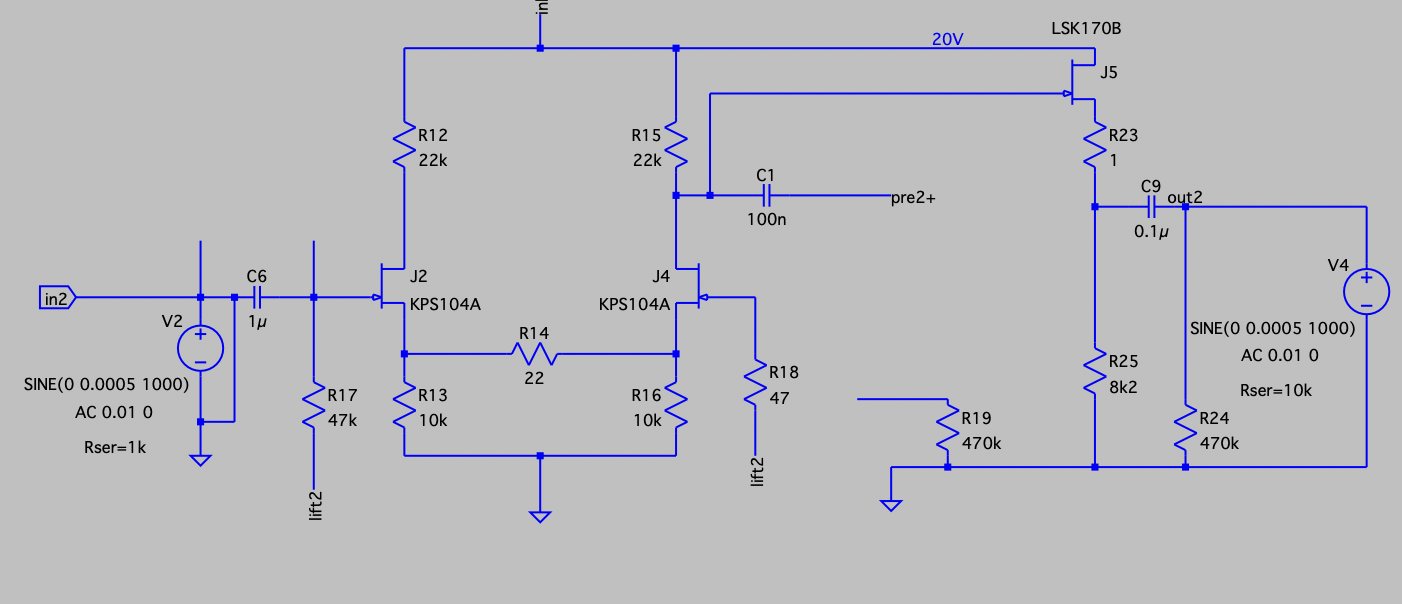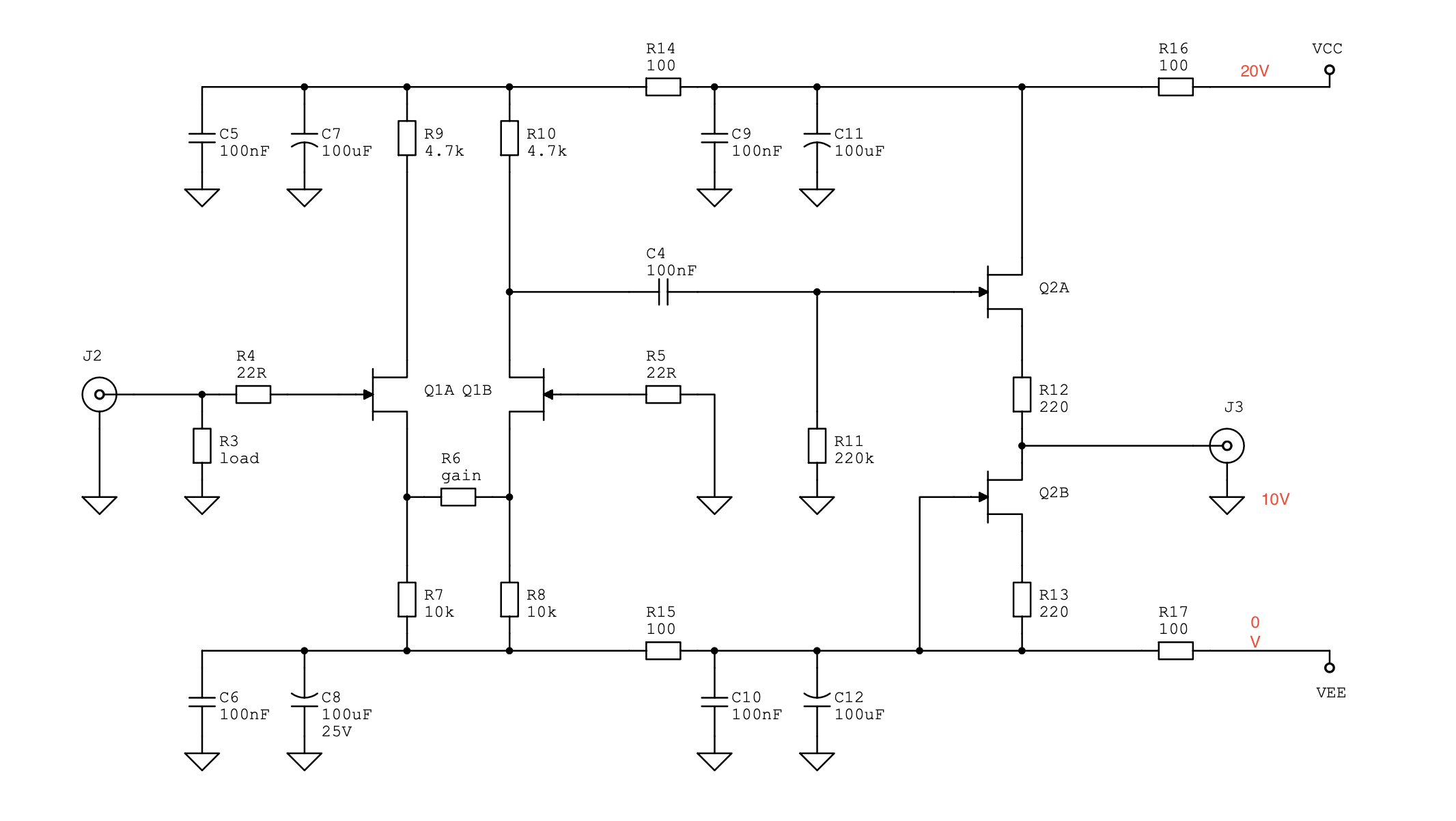 - теперь рассмотрим Q2A/Q2B из схемы Хагермана: Q2B затвор = 0В, исток = 0В + VR13, сток пока не понятен. Это - типичный источник тока, конкретный ток которого можно вычислить по вольтамперным характеристикам, но я сейчас предположу, исключительно для целей наглядности, что мы добиваемся напряжения на затворе -2В относительно истока (чуть позже расскажу, откуда взялось это значение), а значит на истоке будет 2В и ток этого источника тока будет около 10мА. Q2A и Q2B включены последовательно, соответственно, на R12 будут ровно те же 2В, а так как затвор Q2B у нас подключен к = 10В, то на стоке Q2B должно быть тоже 10В (цепи Q2AR12 и Q2BR13 идентичны и через них протекает одинаковый ток). Соответственно, на J3, включенном относительно 10В, будет напряжение = 0В. Что касается сигнала: за счёт С4 амплитуда сигнала будет складываться без постоянной составляющей с потенциалом затвора Q2A и для выполнения правила п.3, с учётом моих предположений, не может превышать 2В (это значение было в первых характеристиках Piccolo, откуда я его и предположил).