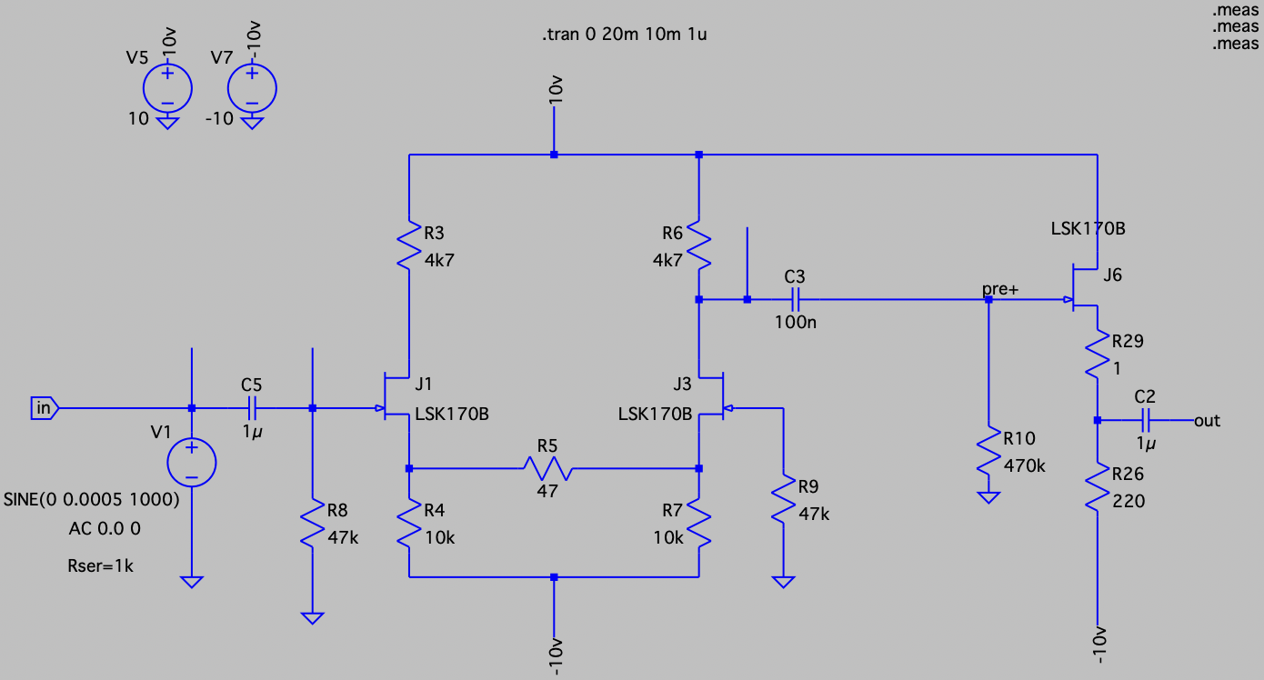 Если теперь вернутся к твоей схеме, то она существенно отличается от Хагермана. Источника тока, задающего режим работы выходного каскада и устанавливающего 0 на выходе, у тебя нет. Соответственно, как это будет работать: затвор J6 = 0В (по твоей схеме), сток = +10В, исток = -10В + VR26, что даже для нулевого потенциала на затворе будет означать ток 10/0,22=45мА! Нулевой потенциал на затворе - это риск нарушения правила п.3 даже без сигнала! Конечно, примерно 0,6В у нас есть, но не факт. Увеличение R26 уменьшит ток, но также появится постоянная составляющая на out, которую ты сейчас убираешь C2 (вспомни, у Хагермана этого конденсатора не было). Можно R26 вторым концом подключить к сигнальной земле, но тогда постоянку с out без C2 не убрать.
