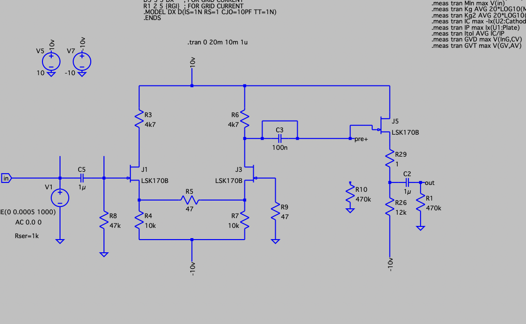 - применяя п. 3: нам не стоит создавать предпосылки положительного напряжения на затворе. Из этого следует, что напряжение сигнала, подающееся на вход не должно превышать по амплитуде отрицательного напряжения на затворе. Насколько я помню, Хагерман заявляет о допустимом напряжении 1В на входе, что создаёт нам ориентировочную рабочую точку в 1,1 мА. Фактически - твой первый каскад является повторением Хагермановского (ну, кроме C5).
