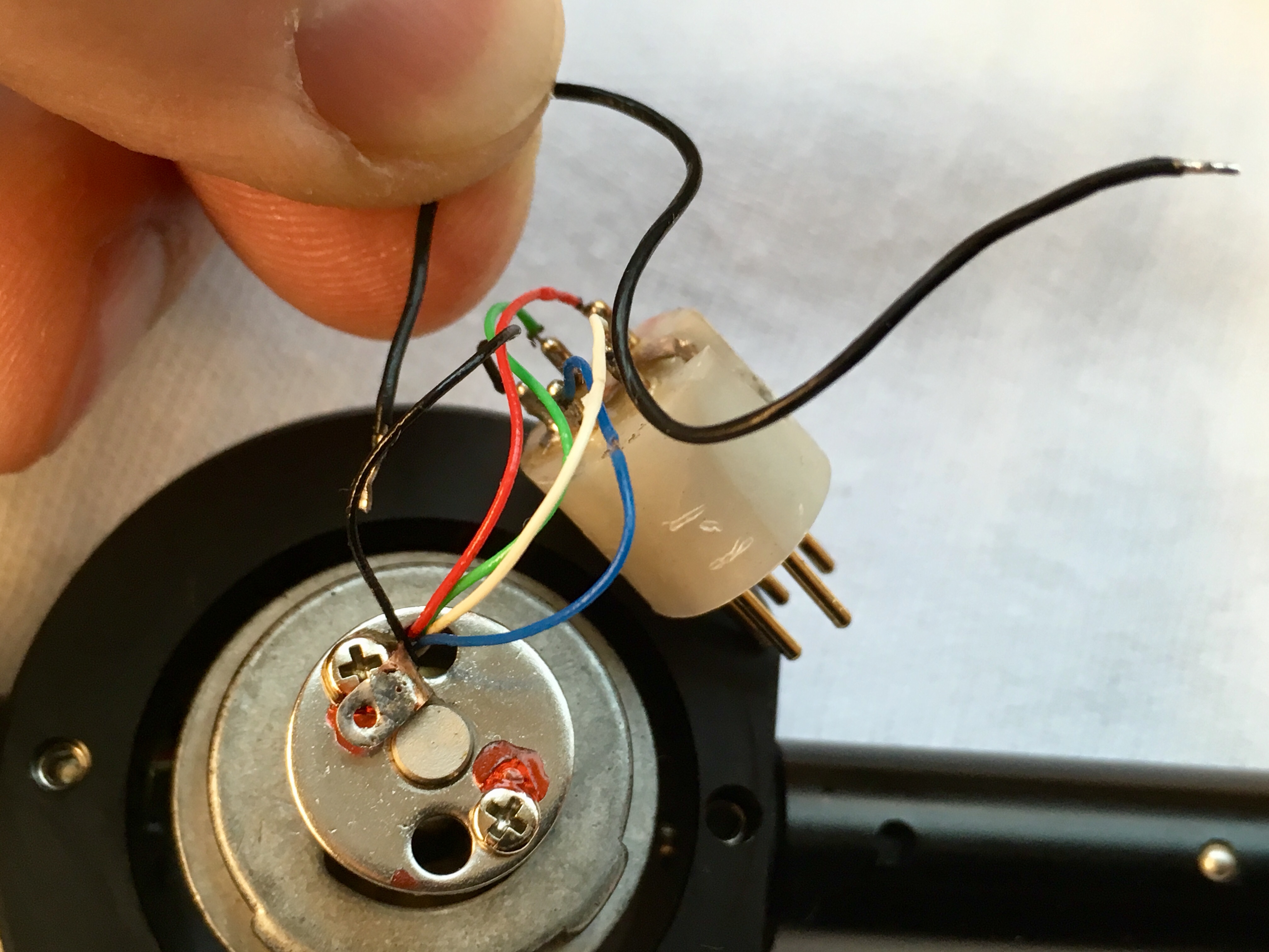 Я занялся тем, как провода проходят через тонарм. Это чисто мои умозаключения, но я пришел к выводу, что это важно, ибо может препятствовать движению тонама и вызывать причину решаемой проблемы.Так и оказалось. Есть два отверстия, но только в одном провода не мешают.