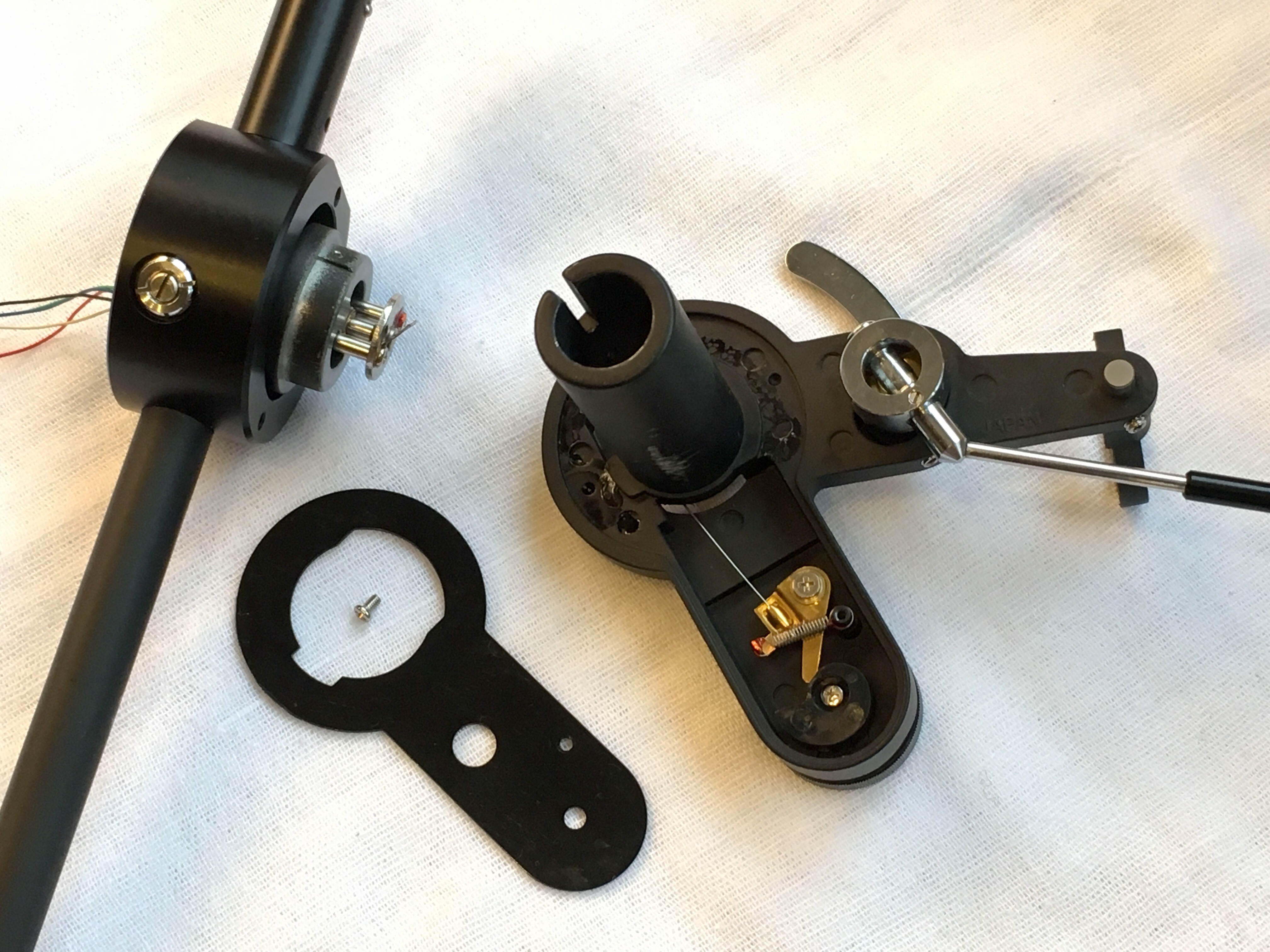 После чего можно будет снять основание с антискейтингом и арм-лифтом. Коннектор свободно выйдет из трубки вверх. Достать коннектор без этого (вниз) не получится, проводка очень короткая. А именно она была теперь моей целью. Я грешил, что ее перекручивание и ведет тонарм.