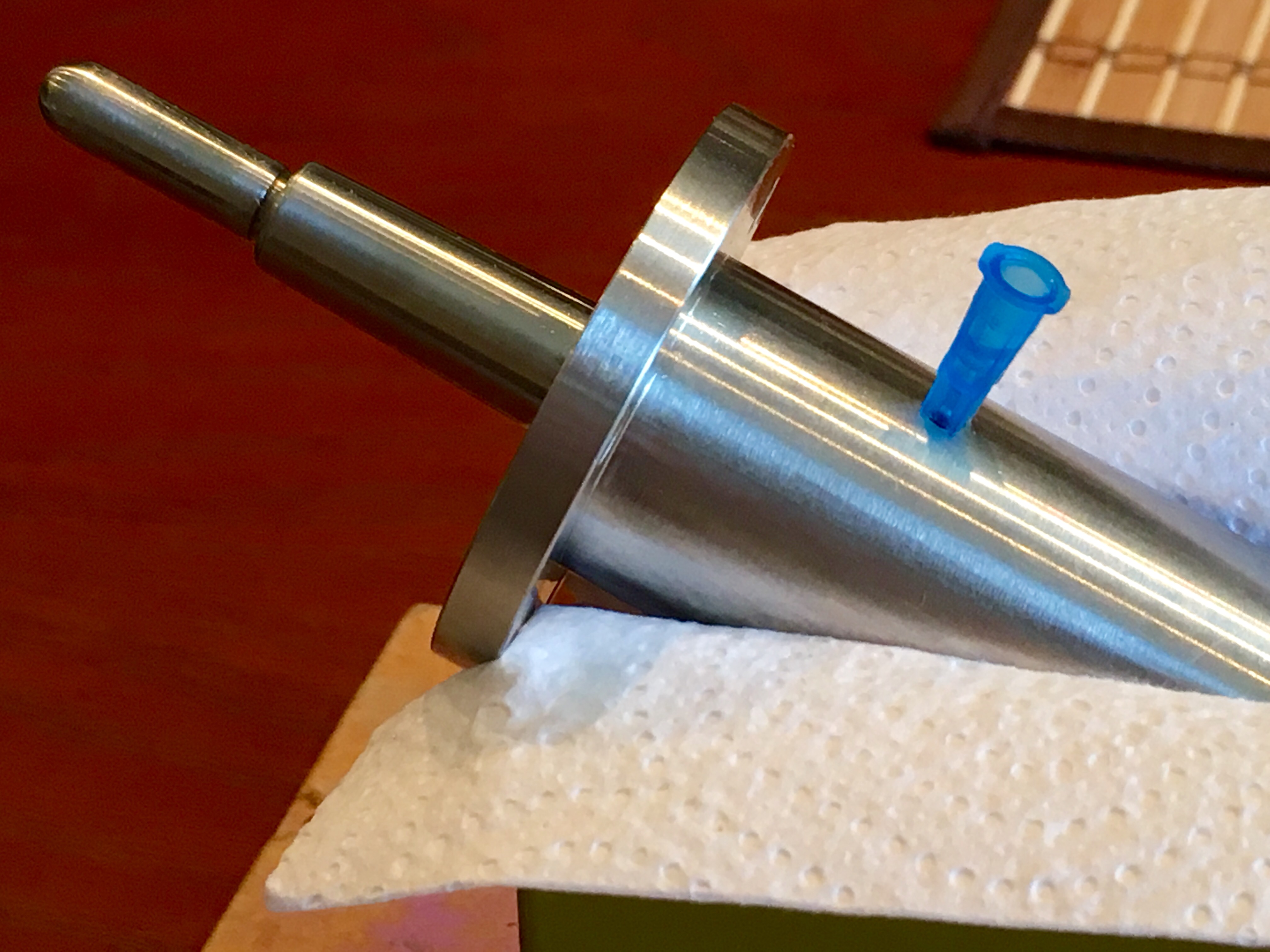 Не могу сказать, что дело пошло. Мне удалось залить совсем немного масла (примерно 1,5 мл.), с промежуточным откачиванием воздуха (сам он не выходил). Из верхней втулки оно так и не потекло. Я вращал вал и двигал его продольно, выбирая имеющийся люфт. При этом я переворачивал шпиндель, надеясь увидеть-таки потеки масла. Но, этого не случилось. И у меня не было уверенности, что его там уже достаточно и все смазалось, как надо. И я решил разобрать шпиндель, с тем маслом, что уже закачено.