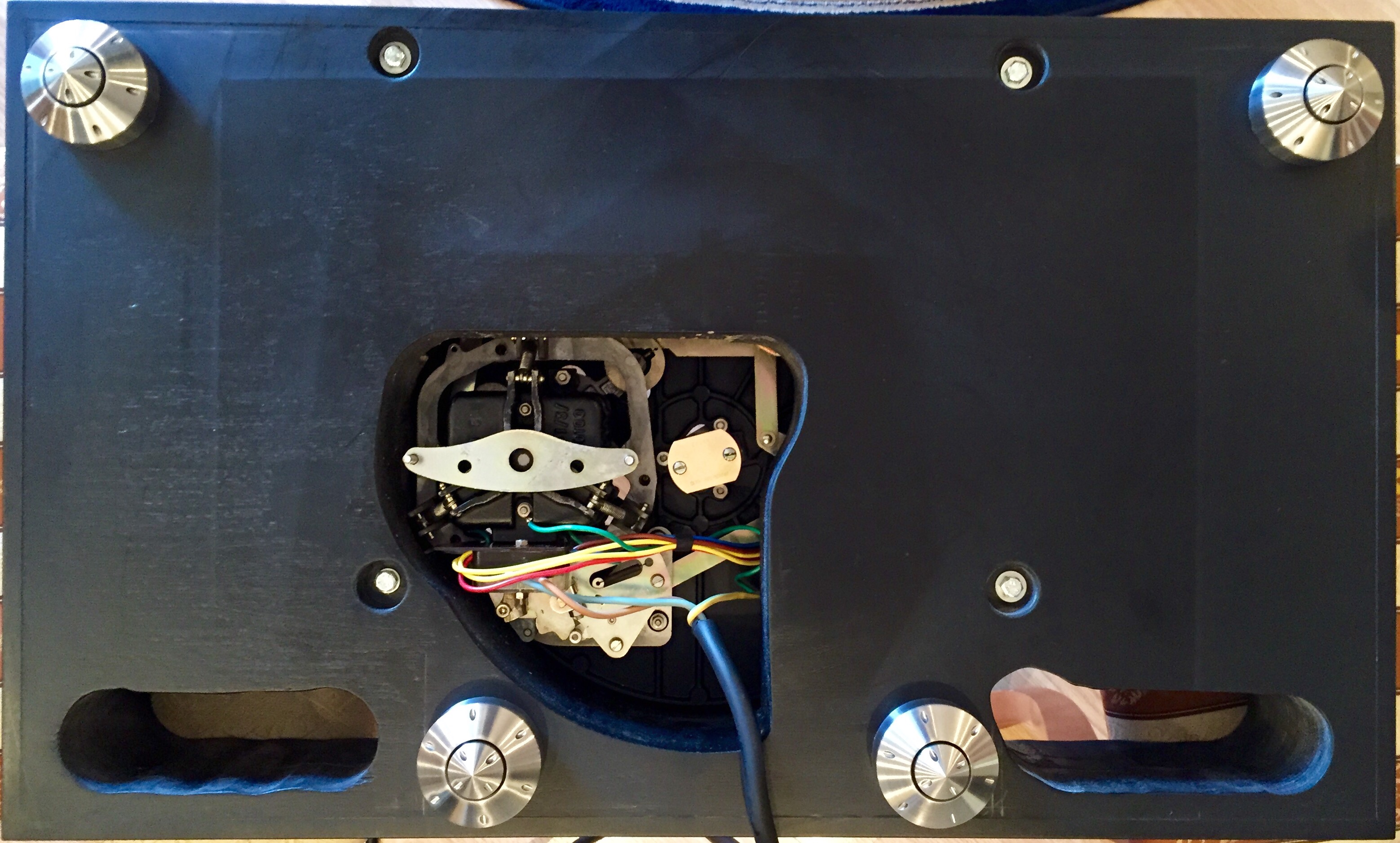 Из стандартных это ни у кого не получается. Плюс задние ноги моего проигрывателя создают проблему. Если их продлить до пола - перекрывают разъемы фонокорректора и предусилителя, стоящих снизу.