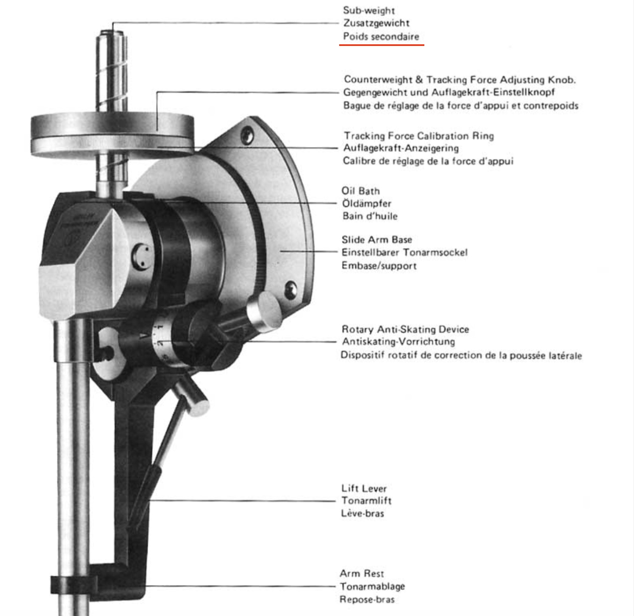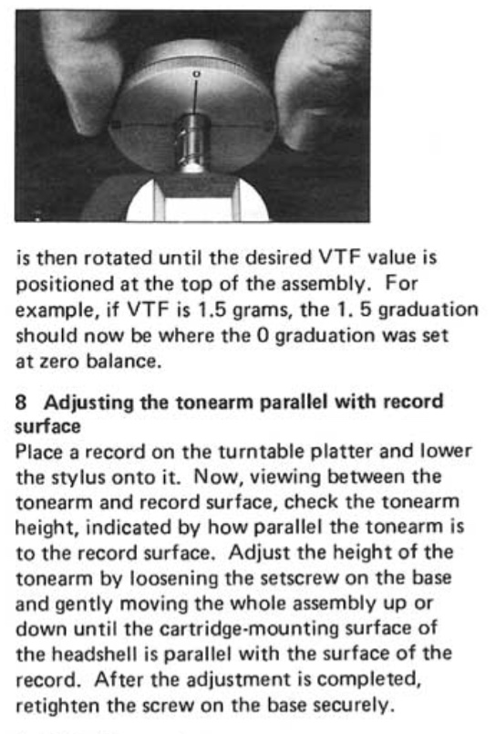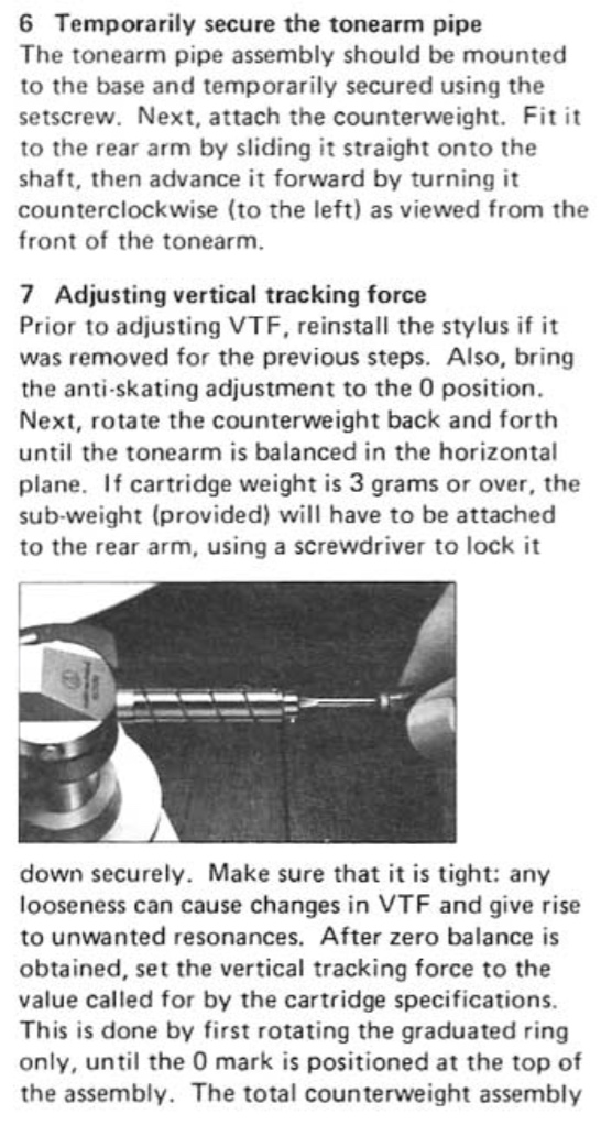 Похоже в этом тонарме не хватает одной детали. А именно - главного контр-веса. Я пока только догадываюсь, но по-моему это вовсе не тот большой кругляшь, что на тонарме сзади. Должна быть деталь, что вворачивается в хвостовик - внутрь трубки тонарма. По идее это и есть основной вес. Вот вырезка из инструкции: