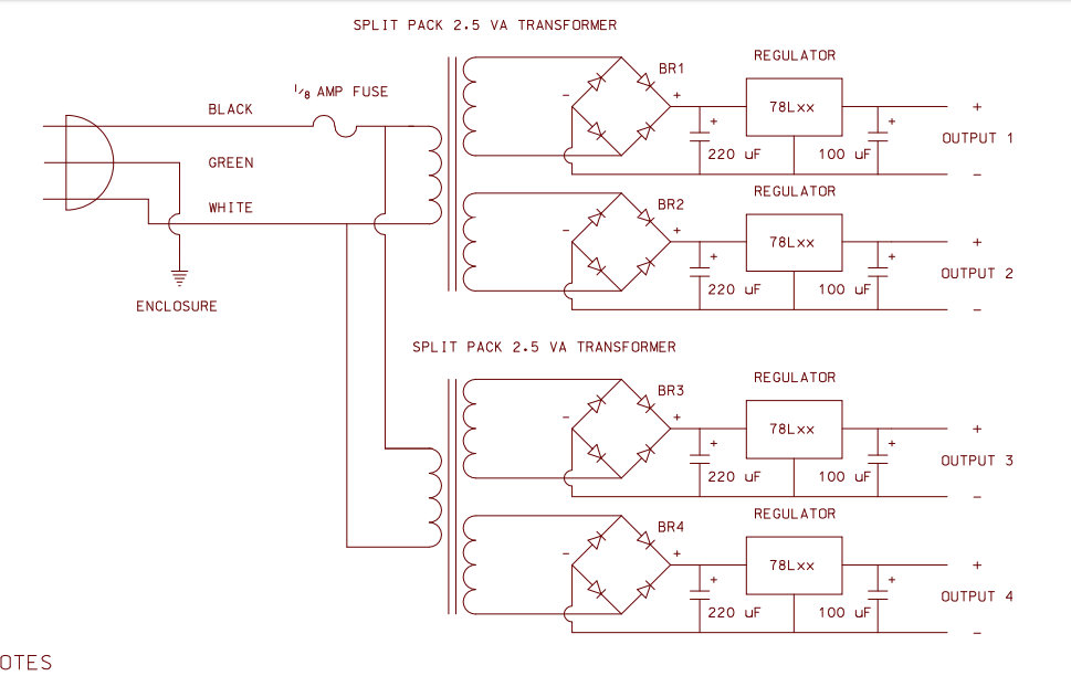 4 трансформатора, 7 выходов. 6 до 100мА (по факту итого меньше, 5-30мА), 1 на стабилизаторе в корпусе ТО 220, до 250мА выход ориентировочно.