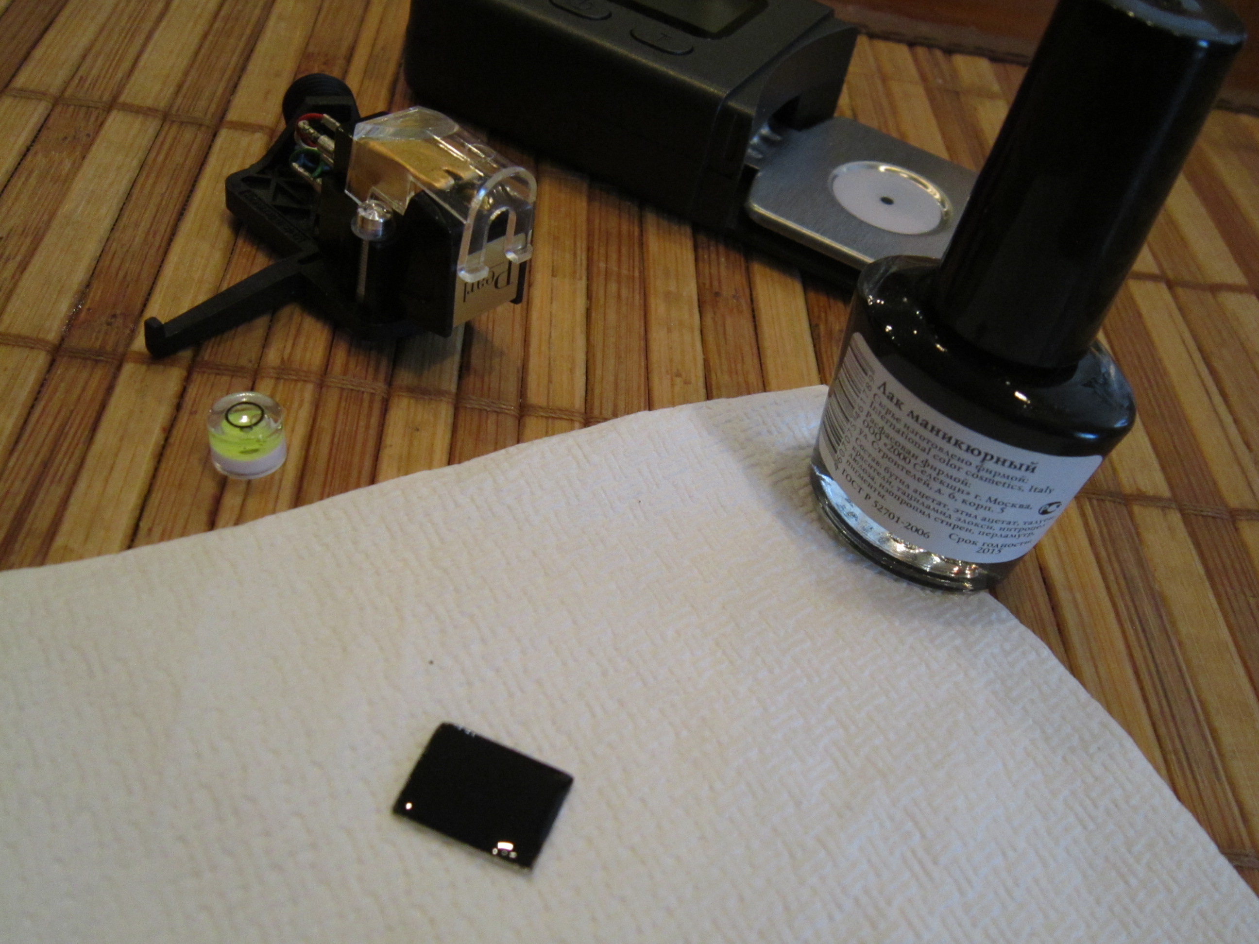 Получалось, что пластинка находится слишком низко. Я с этим уже сталкивался (viewtopic.php?p=862#p862). Исправляется увеличением толщины мата, но новый мат я заказал такой же - 3 мм. Или прокладкой между картриджем и шеллом. Ее я и вырезал из крышки от компакт диска.