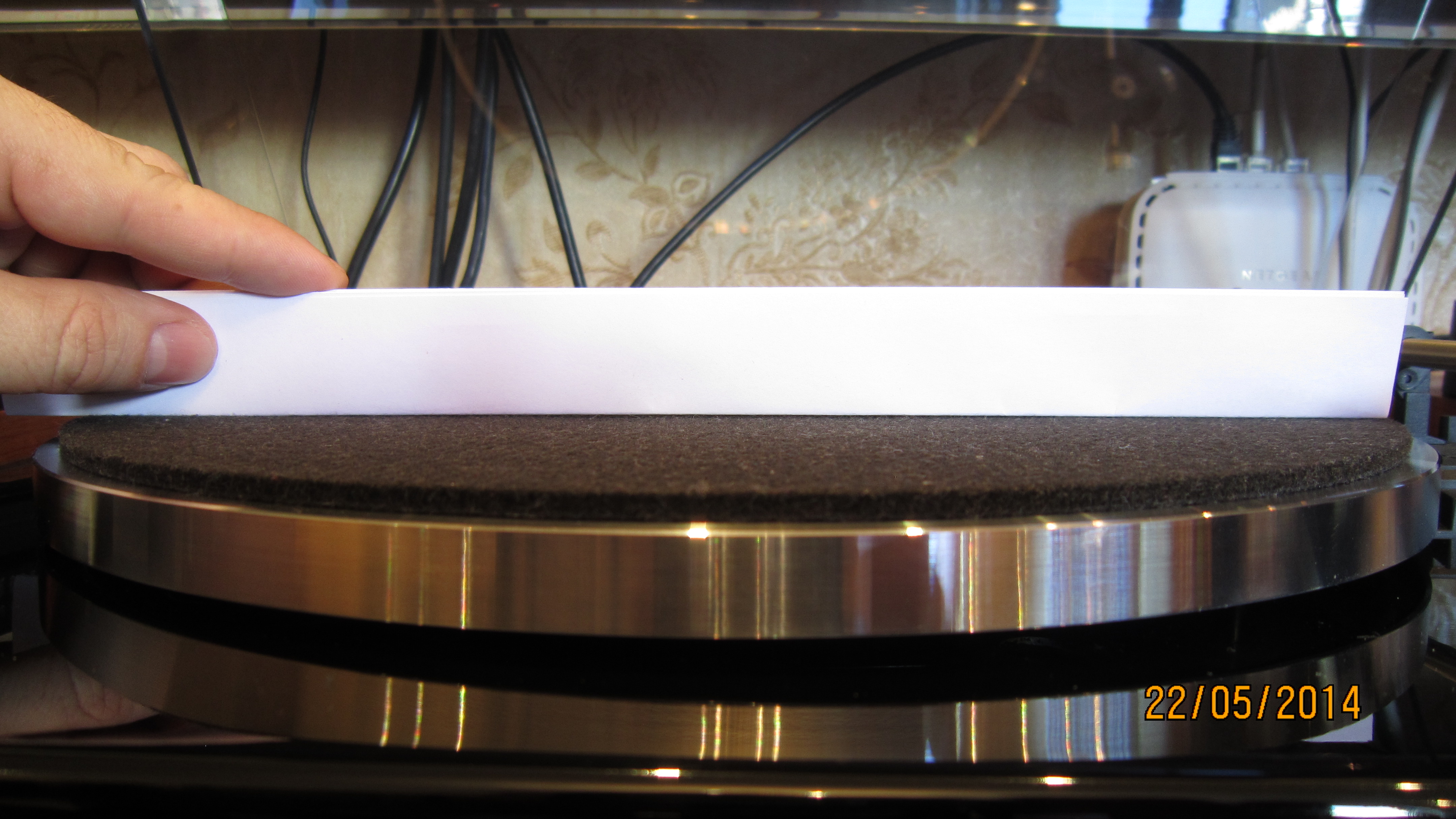 Мат отделяет пластинку от резонансов опорного диска, но клэмп прогибает его вместе с пластинкой. Я применил простое решение (возможно оно временное), подобрал шайбы на шпиндель, таким образом выровняв линию опор.