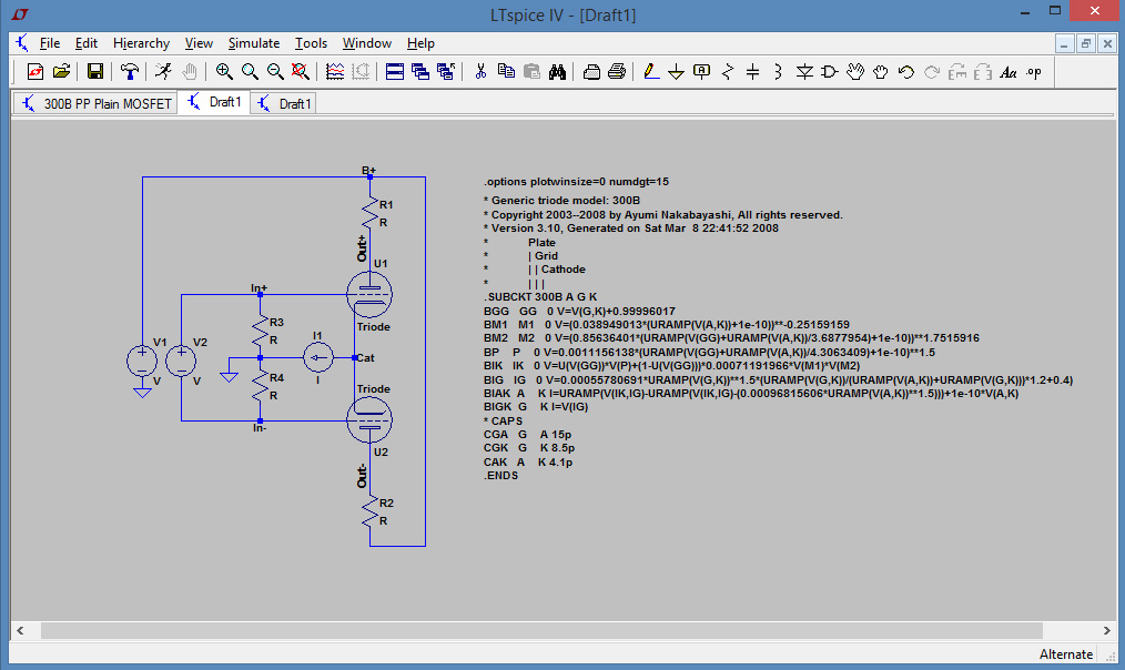 Итак, запускаем программу, нажимаем на кнопку Новый (отмечена цифрой 1 ранее). Вводим модель триода 300B, для чего нажимаем на кнопку .op (15) и копируем собственно модель: