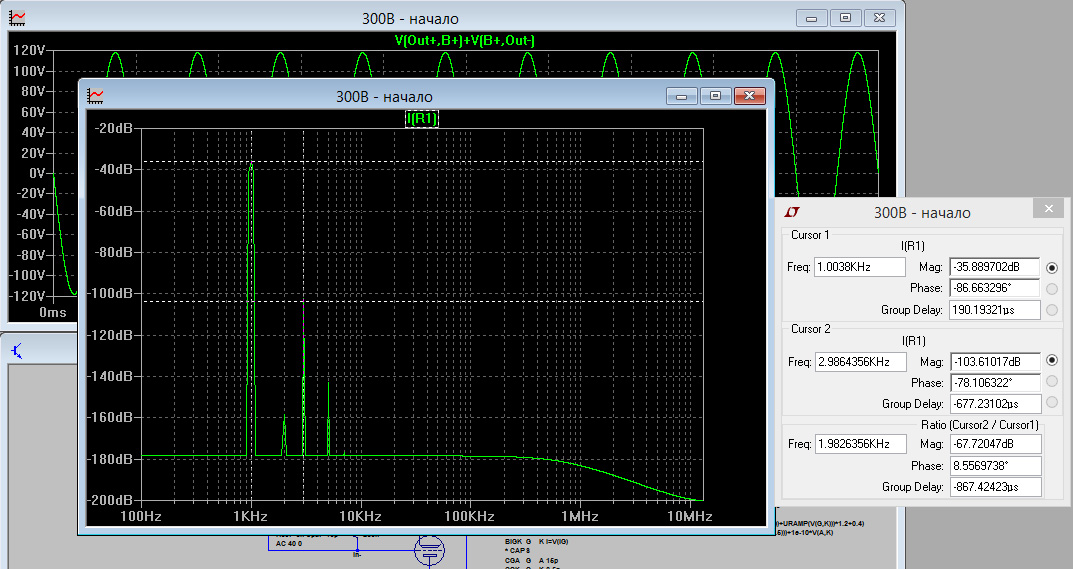 записывает в переменную MPL минимальное - min - напряжение на катоде V(Cat) За весь период измерений. Такие же измерения проводятся для GRL1 (максимальное - max - напряжение сетка-катод первой лампы), GRL2 (максимальное - max - напряжение сетка-катод второй лампы), IU1U (максимальный - max - ток через первую лампу), IU2U (максимальный - max - ток через вторую лампу), IU1D (минимальный - min - ток через первую лампу), IU2D (минимальный - min - ток через вторую лампу), VIN (амплитуда - max - напряжения на входе), VOUT (среднеквадратическое - RMS - напряжение на выходе), IOUT (среднеквадратическое - RMS - значение тока на выходе).