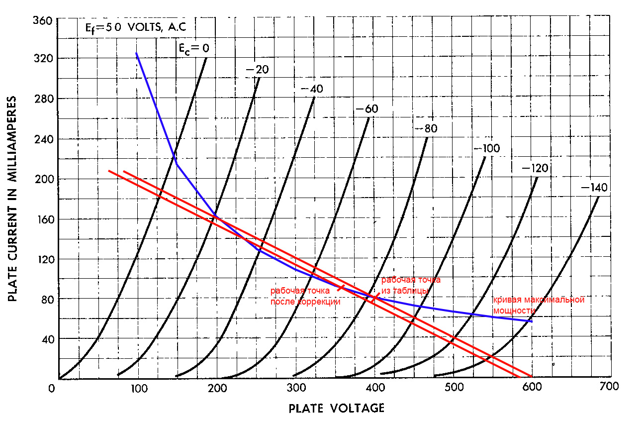 - напряжение смещения (катод-земля): его можно определить из той же таблицы, откуда мы взяли параметры нашей рабочей точки (400В@80мА) =-84В.