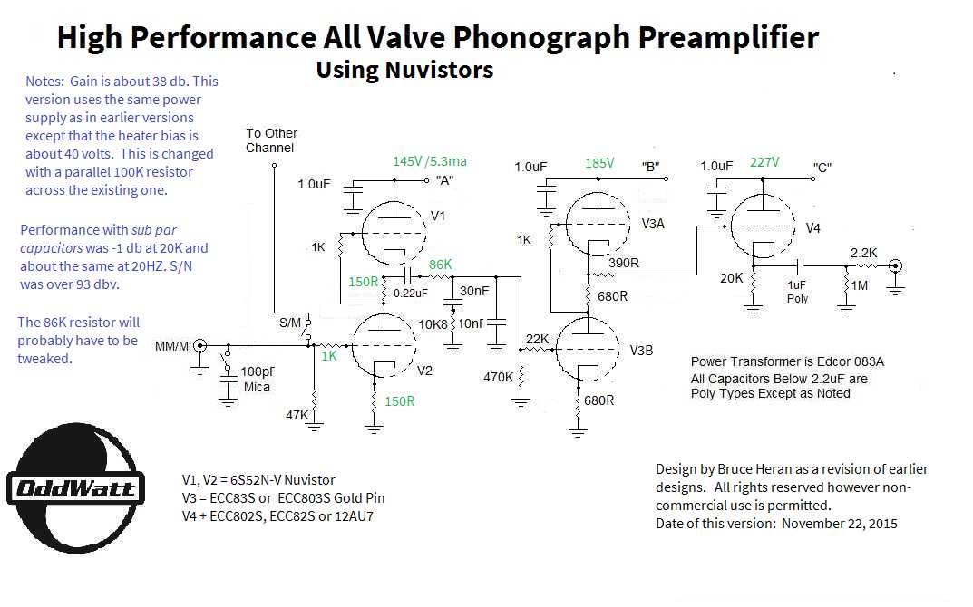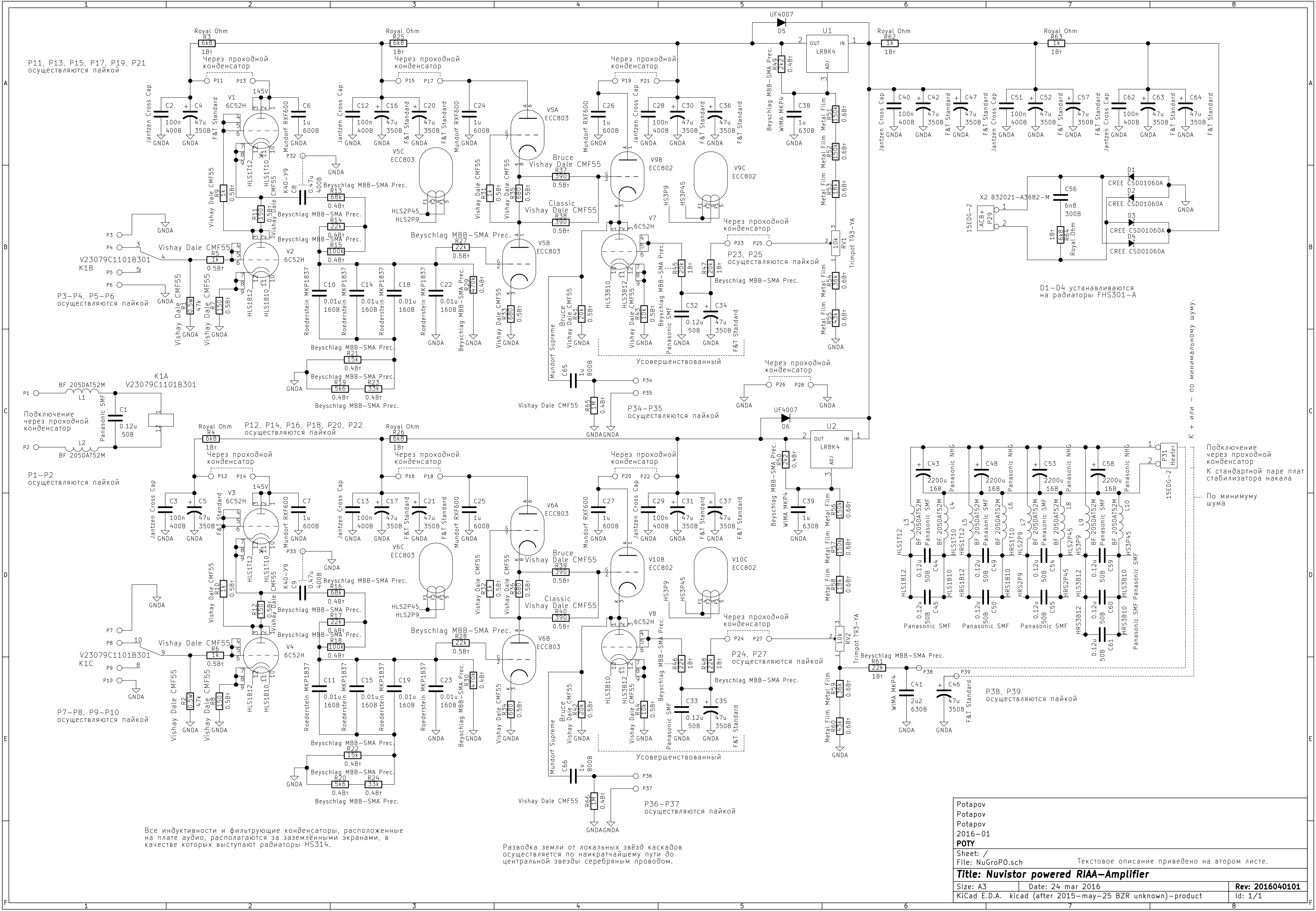 Что касается нувисторов. Я готов в кратчайшие сроки (около недели) разработать печатную плату первого каскада (как у Брюса) на нувисторах, вместе с цепочками RIAA и питанием, запустить её в производство (ещё неделя сверху) и выслать Евгению на сборку. Нувисторы у меня есть, но я могу их купить ещё, чтобы был выбор. Это несколько удорожит проект, но вещь не невозможная.