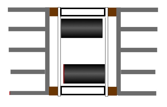 И снова мы не устанавливаем один из конденсаторов (зачёркнут), что позволяет и эти платы установить так же, как и выпрямители, вертикально. Здесь радиатор будет уже чуть потолще, но не выше 15-20мм. Т.о., толщина "пирога" будет 20(радиатор)+6(стойка)+2(плата)+35(конденсаторы)+2(вторая плата)+6(стойка)+20(радиатор)=91мм (возьмём 4 мм для зазоров) = 95мм. Высота и "глубина" будут такими же.