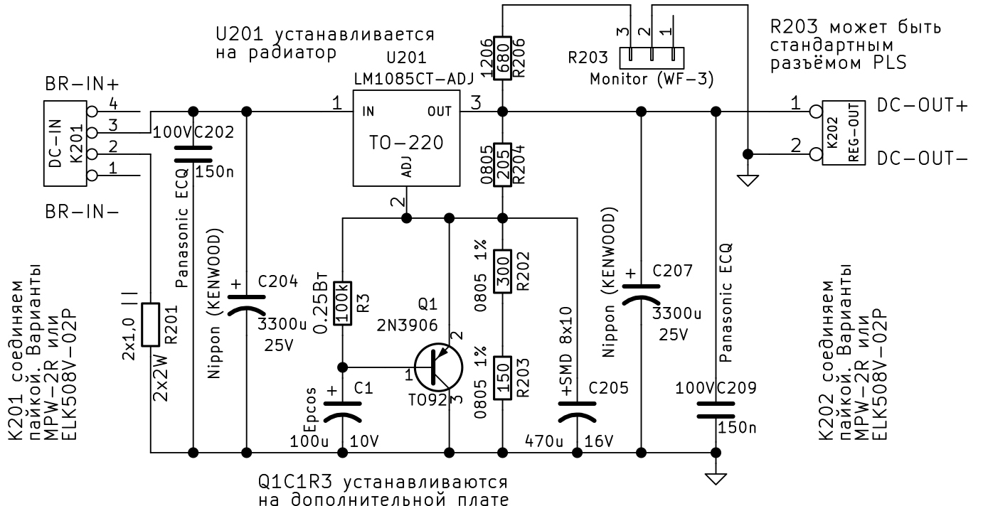 1. Снова вопрос о разъёмах. В этой конструкции их три: два силовых (по аналогии с выпрямителем - K201, K202), один - мониторинговый, для подключения светодиодов индикации включения. Варианты указаны на схемах, можно посмотреть о чём речь на chip-dip.ru.