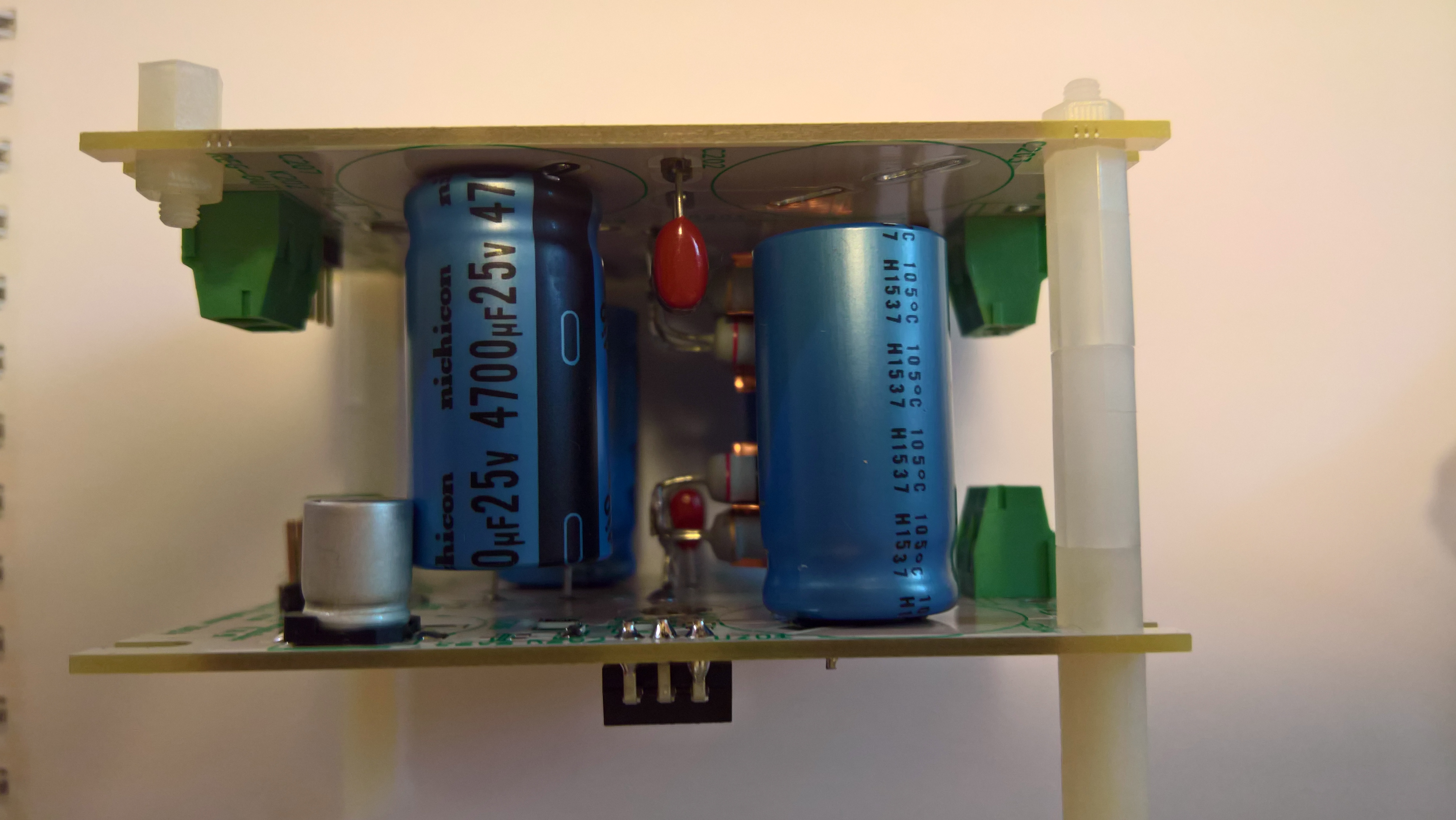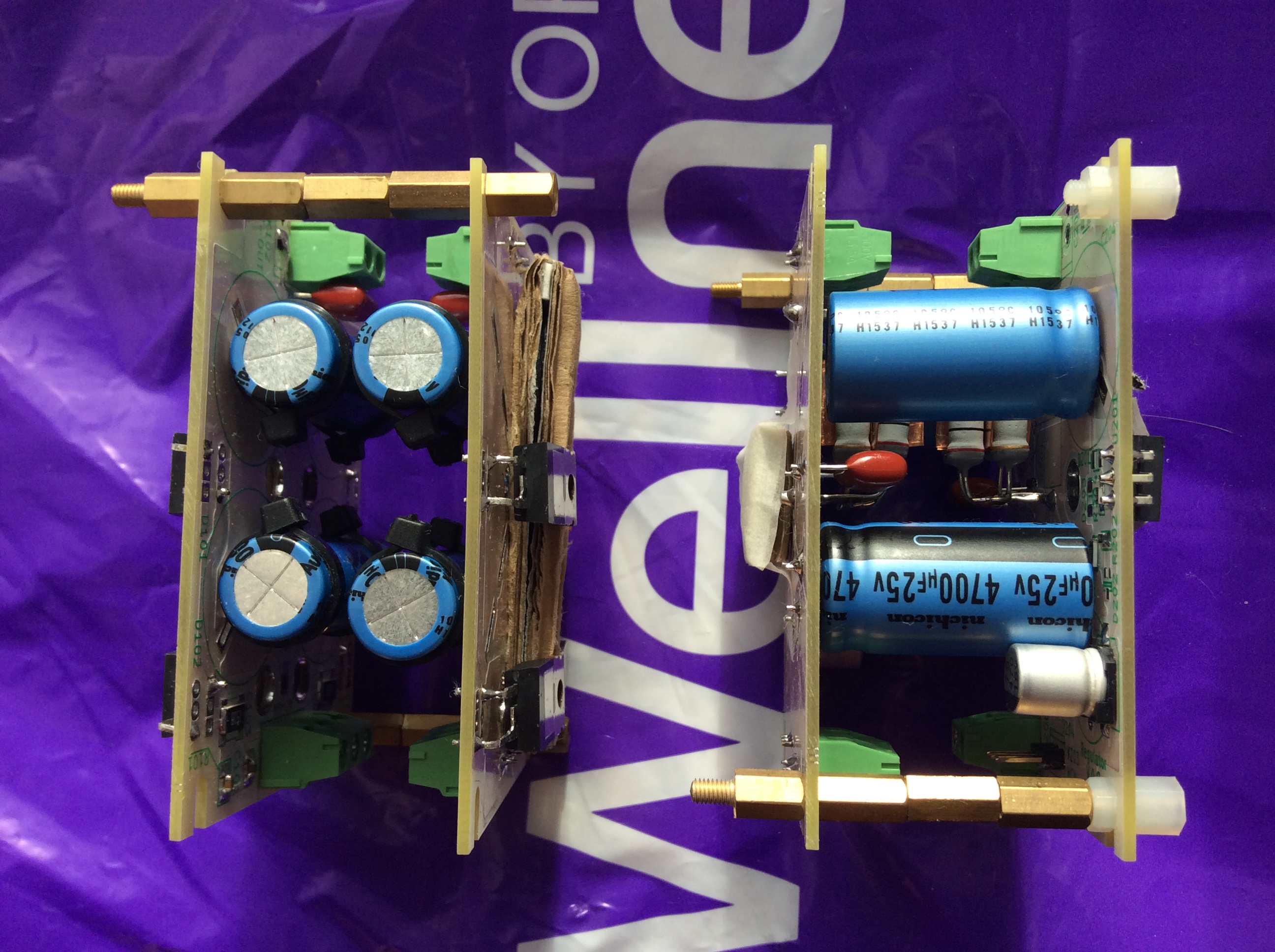 Можно и 30 мм в стабе оставить. Более компактно, к чему мы собственно и стремились. Первоначально смутило, что конденсаторы ( голубой 4700 uf 25V и SMD ) касаются. Потом присмотрелся. В версии с раздвижкой плат на 40 мм они так же касаются. Подумалось- 4V не тот случай, что бы беспокоиться за пробой? В крайнем случае слоем тефлоновой плёнки можно подстраховаться, не безопасности ради, а спокойствия для!