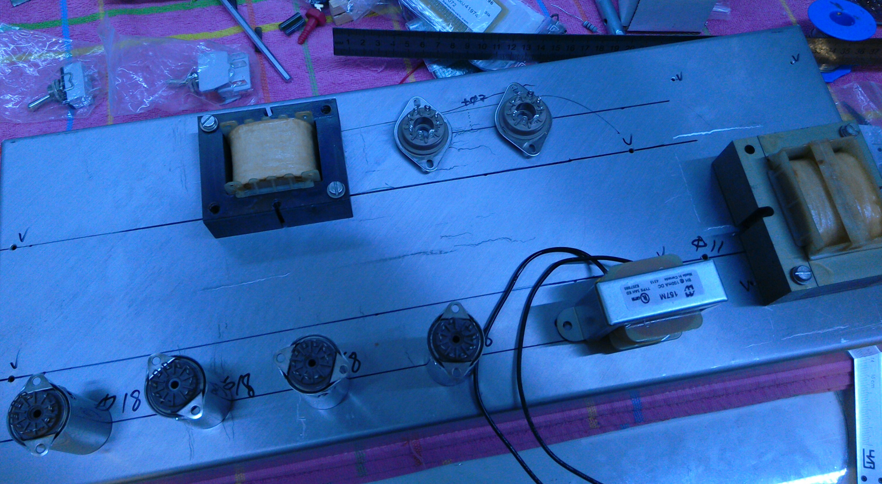 Я сразу хочу оговориться, что силовой трансформатор был заказной и НЕ ИМЕЕТ таких характеристик, как на схеме. Разница в накальной обмотке. Она была заказана на 13 Вольт и накал осуществлялся выпрямленным стабилизированным напряжением, я применил платы стабилизации/накала, любезно предоставленные в рамках акции "возьми бесплатно". Как можно заметить, у нас появился конденсатор 1uF в обвязке DEPTH. Там он развязывает постоянку с потенциометра, чтобы убрать шуршание. В схеме СЛО этого конденсатора нет. Я пробовал убирать его, экспериментировал, разницы в шуршании не обнаружил. Возможно, шуршание появляется со временем, когда потенциометр начинает постепенно доживать свой век. Поэтому СЛО будет без него. ФИ такой же, кстати, этот ФИ Джим Маршалл "позаимствовал" у компании Fender в свое время.