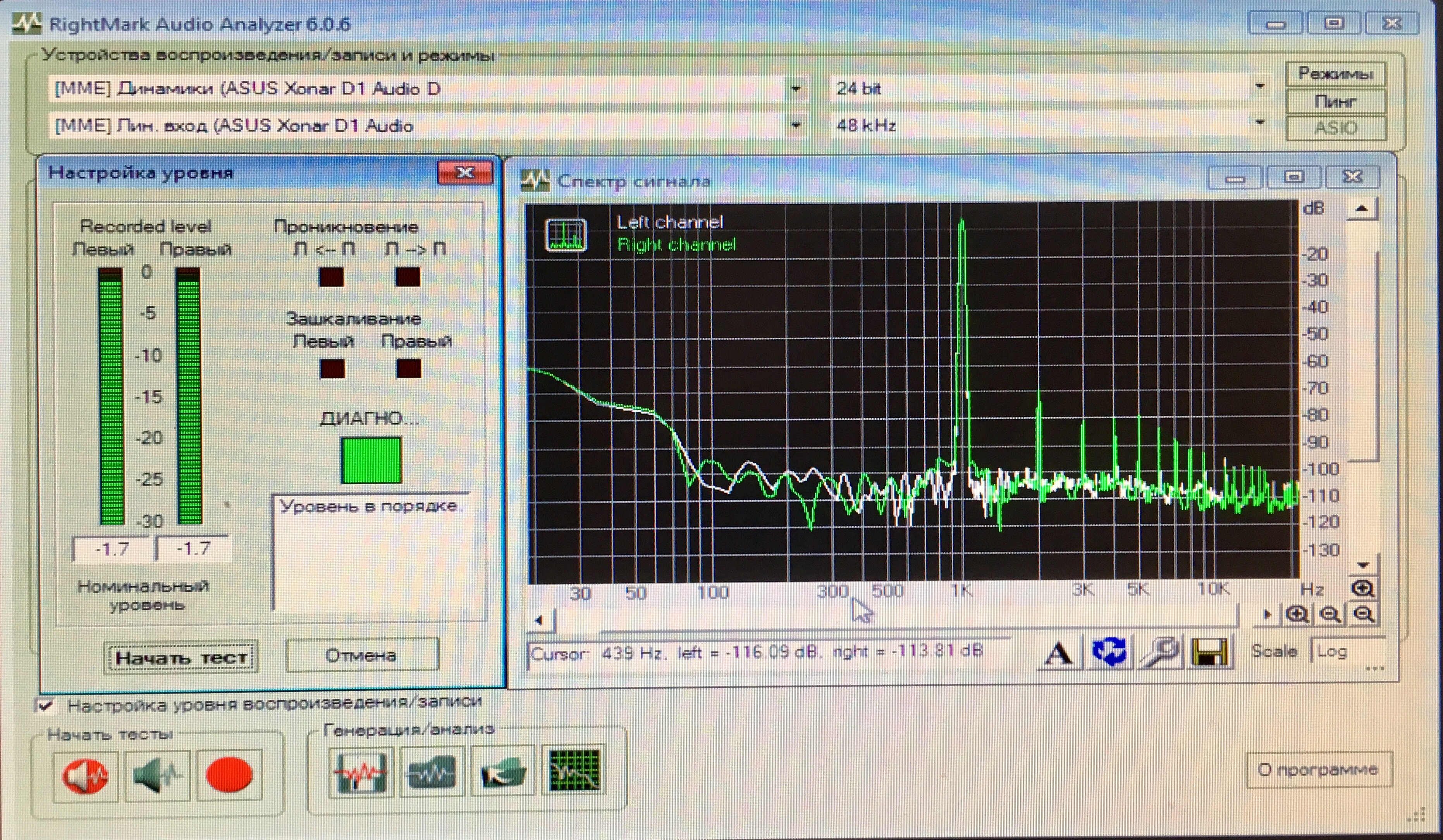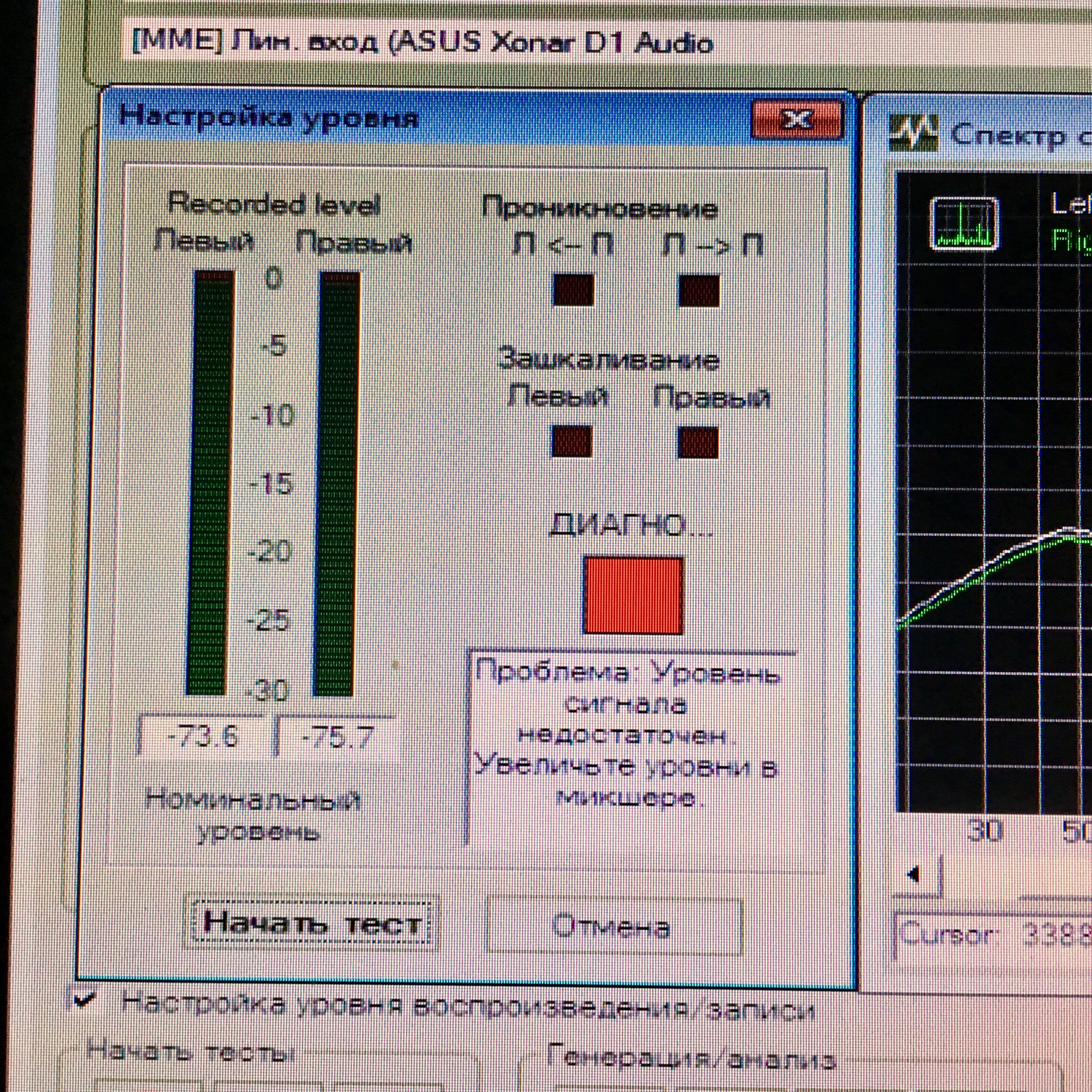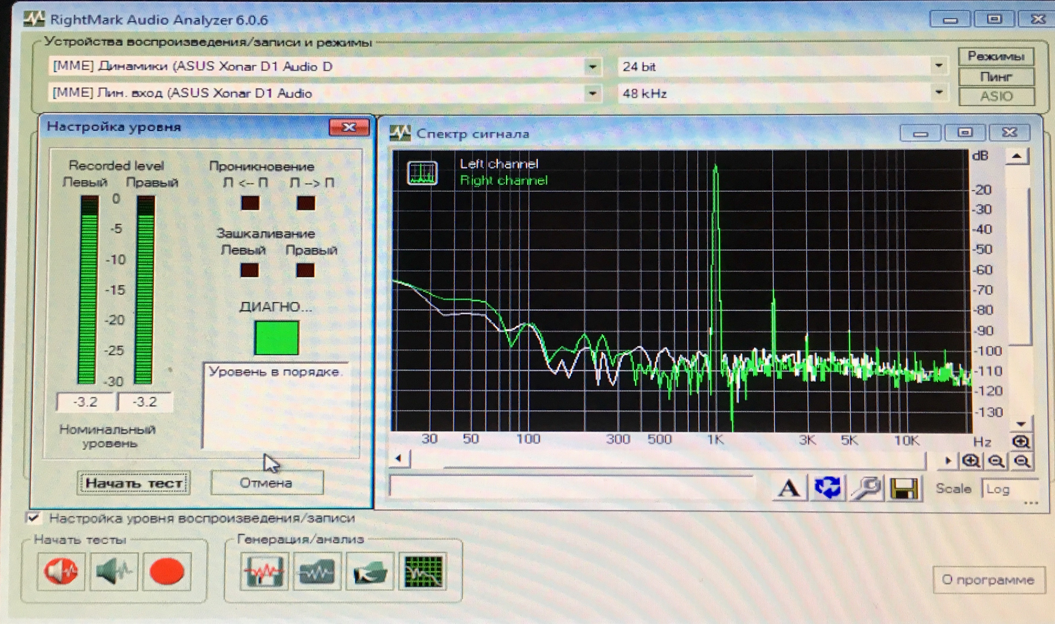 Ян, а есть какие-то мысли, почему мне не удалось настроить уровень для тестирования фонокорректора/предусилителя в связке. У меня не получилось поднять уровень сигнала до зеленого индикатора. Начинает показывать перегрузку по каналам.Алаев Ян писал(а):Когда идет настройка уровней, то в окне сразу виден спектр гармонических искажений.