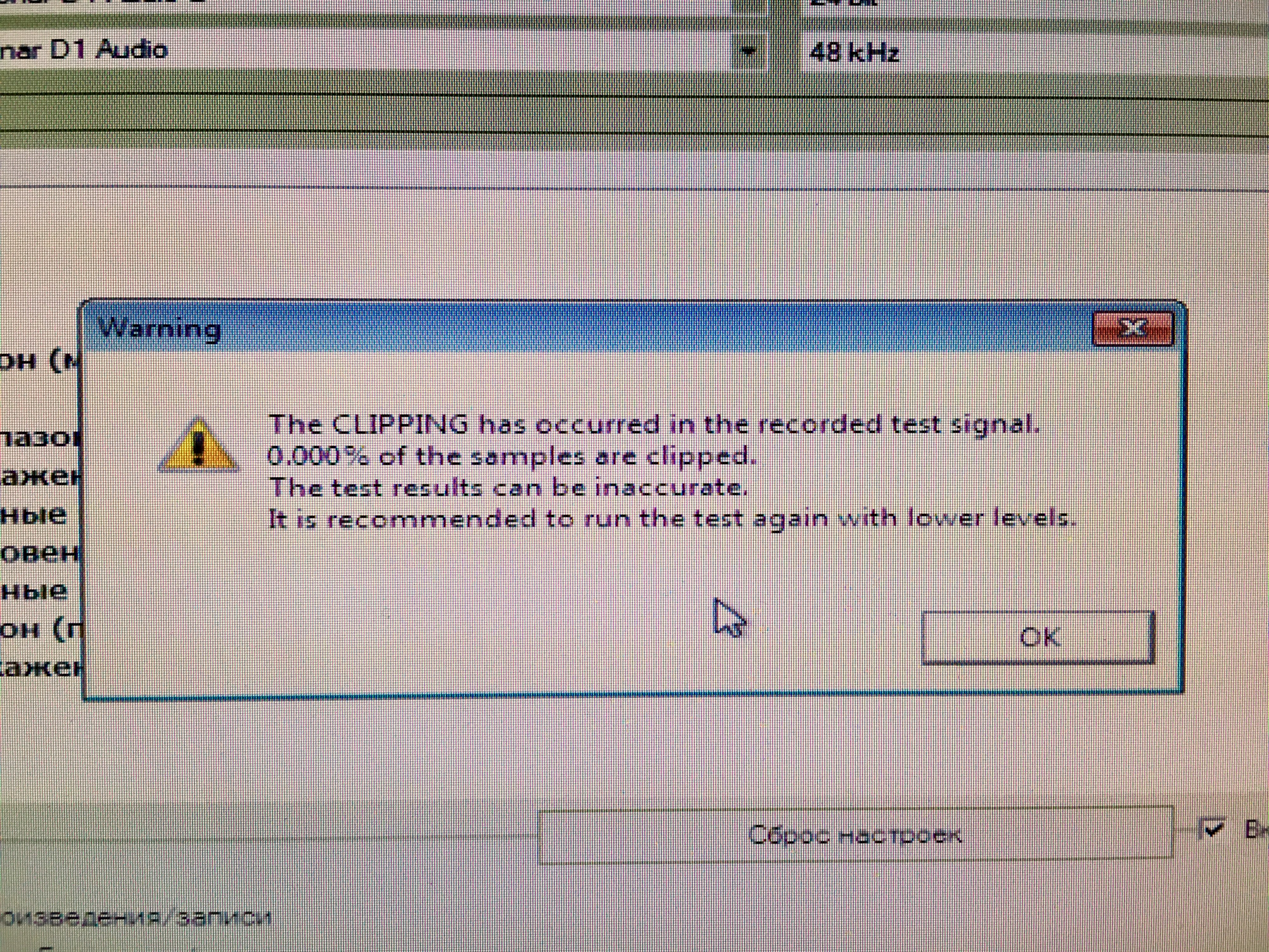 Со вторым корректором сразу тоже не вышло. Уровень сигнала без аттенюации вполне подходил для теста: Но, при тестировании выходило сообщение об ошибке: Пришлось постепенно понижать уровень сигнала на медиаплеере, тест прошел с -2 дБ. CREK OBH-8SE B 24-bit, 48 kHz