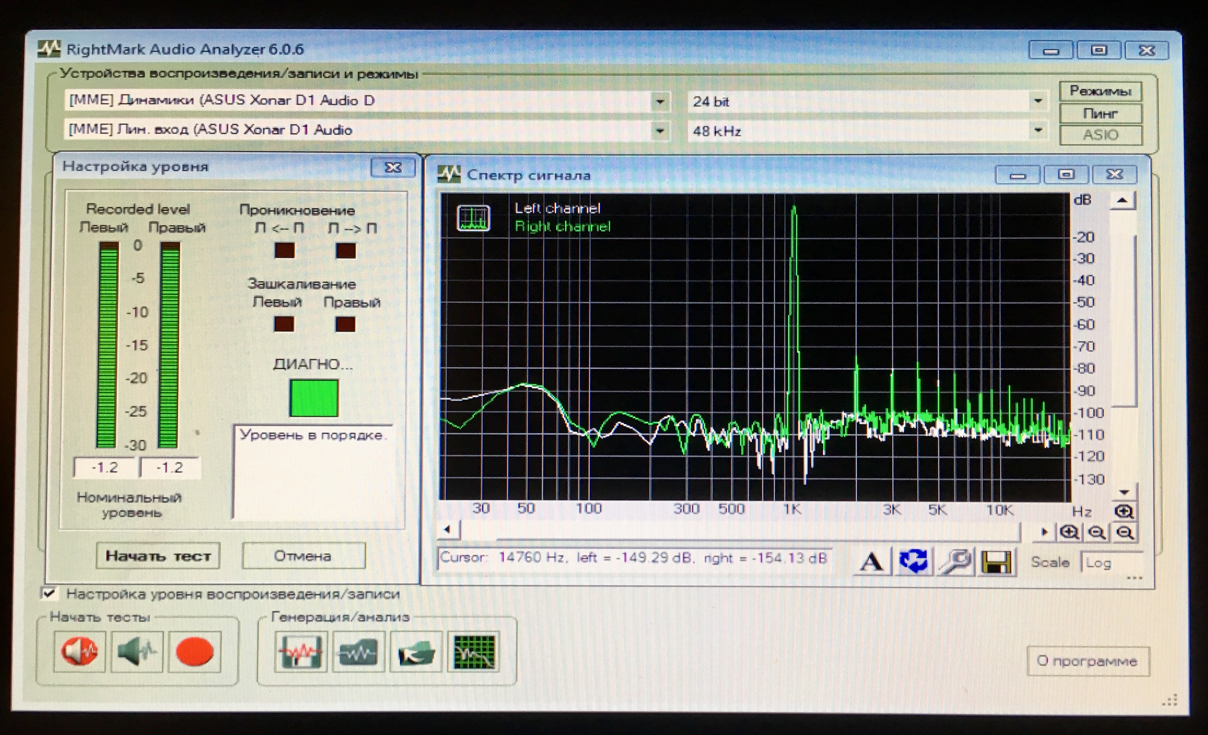 Я взял на себя смелость точно подстроить уровень сигнала для теста, под параметры, с которыми только что тестировал с плеера саму плату. С помощью аттенюатора предусилителя это было не сложно. Но, громкость на предусилителе не на полную, примерно 80%.