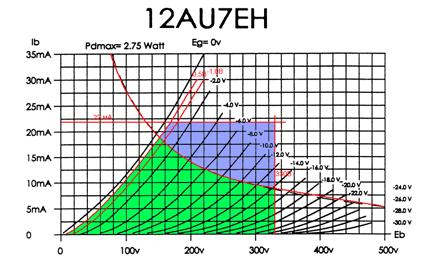 Попробуем учесть ограничения лампы используя её ВАХ. Это также позволит расширить расчёты и одновременно посчитать рабочую точку. Я приведу ВАХ для 12au7, на этом графике уже выделена безопасная зеленая зона для рабочей точки с учетом ограничений и синяя зона, расширяющая возможные значения токов и напряжения для переменного тока (рабочей характеристики).