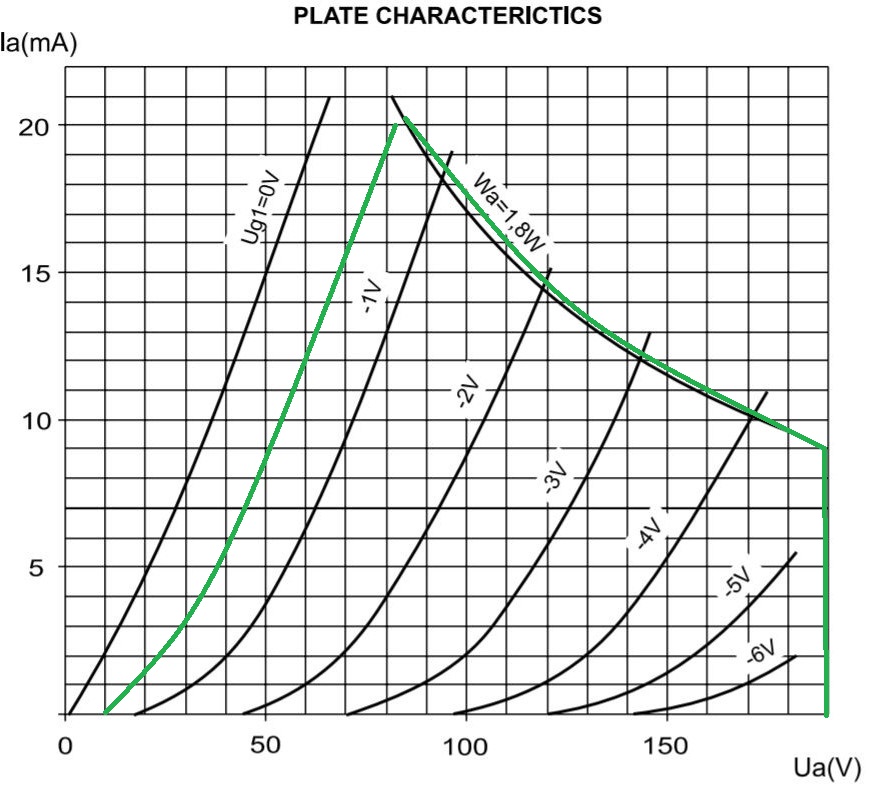 Справа - вертикальная линия - это ограничение по анодному напряжению. В данном случае, имеется лишь одно значение, однако часто приводят два: при полностью закрытой лампе (так называемый холодный старт) и в рабочем режиме (а выше, для ECC88 мы видели даже три!). Нужно понимать, что значения для рабочего режима ограничивают выбор рабочей точки, а значения для "холодного старта"/закрытой лампы - рабочих характеристик. В данном случае нам приходится ориентироваться на приведённое значение для обоих случаев.